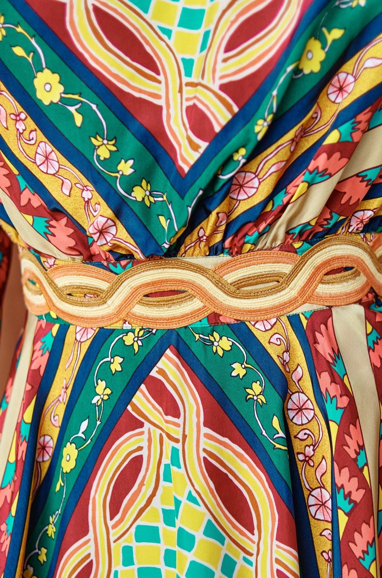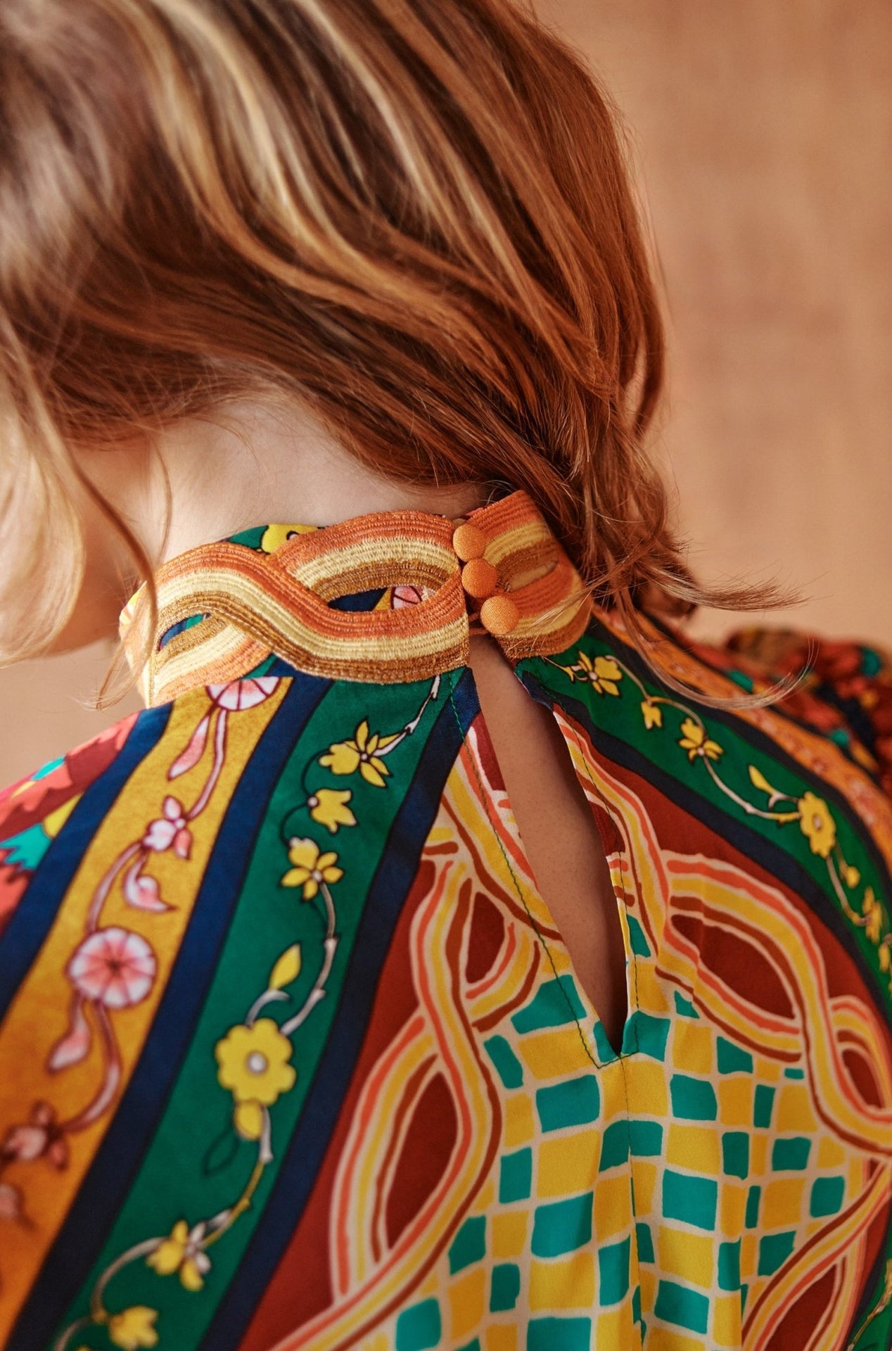 This is a playful and vibrant piece that brings the fun of the '70s to your wardrobe. Featuring a bold geometric print in lively shades of green, yellow, and red, the puff sleeves and high neckline add a touch of vintage charm, fitted to the waist. Perfect for any occasion where you want to stand out, this mini dress pairs beautifully with boots or heels.
