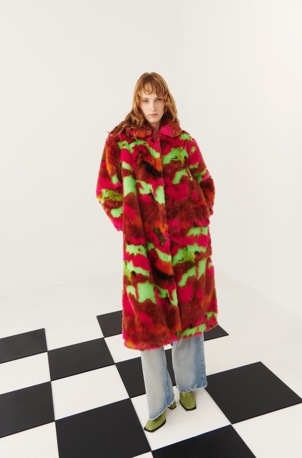 Make a jaw-dropping entrance with our Hardin Coat, designed to turn heads and keep you cozy. This statement piece features a fun mix of pink, green, and earthy tones in a playful camouflage pattern. This faux-fur piece is perfect to add a splash of fun to your winter wardrobe. Wrap yourself in color and confidence with this must-have!