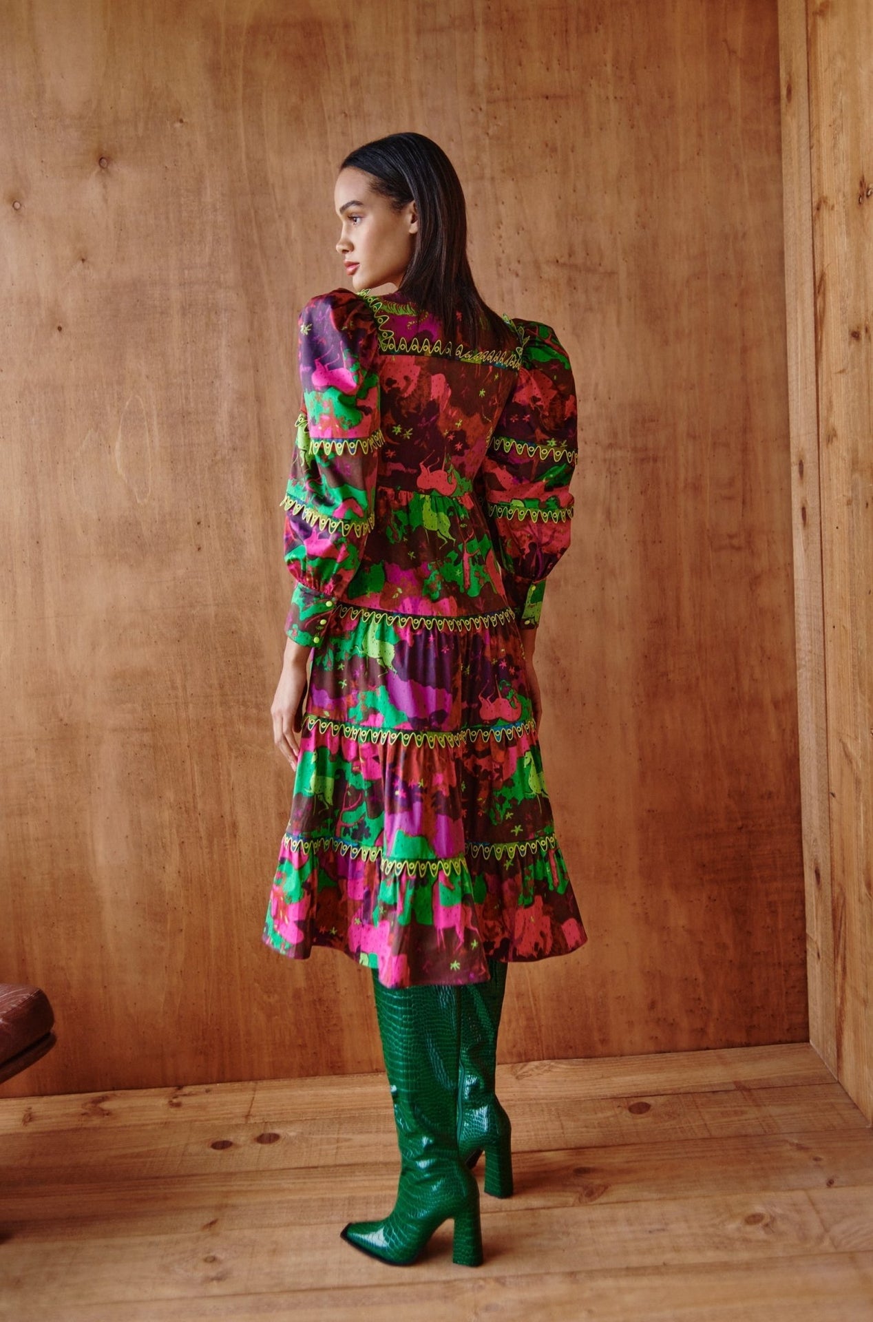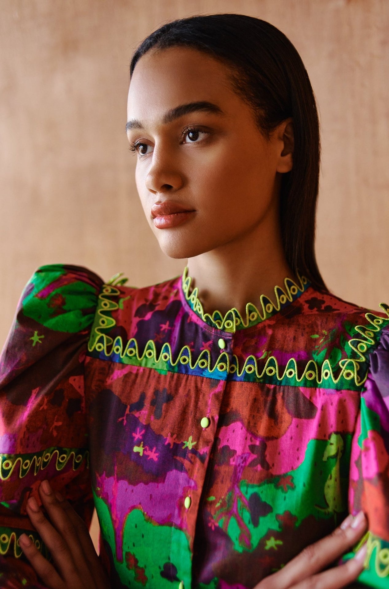 A classic CB silhouette, the Hasu Dress features a bold floral and abstract print in rich hues of purple, pink, and green, perfect for making a statement. With puff sleeves, a tiered skirt with the detachable belt, adorned with an intricate trim detailing along the neckline, sleeves, and tiers. This maxi dress is perfect for festivals, garden parties, or any occasion where you want to stand out!