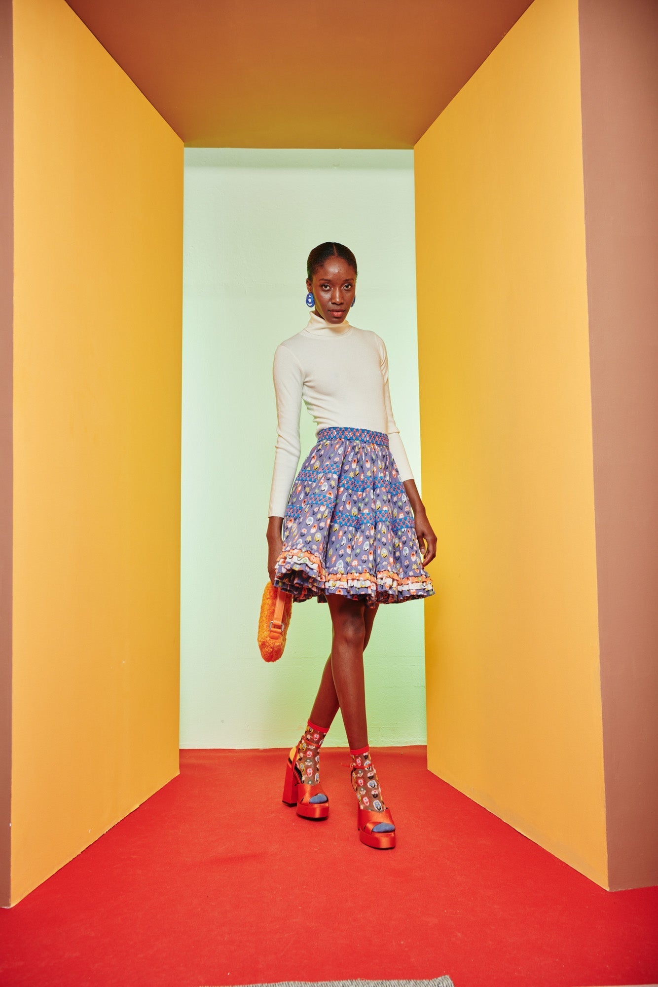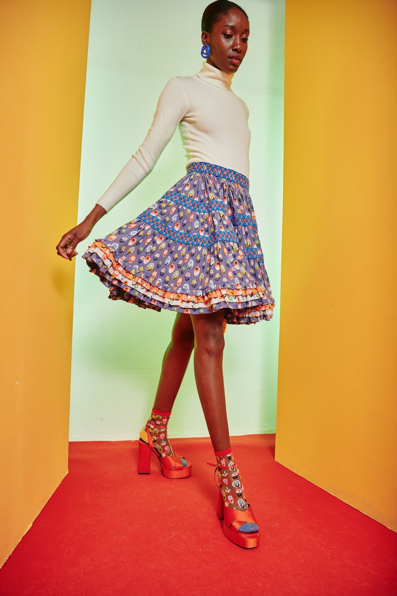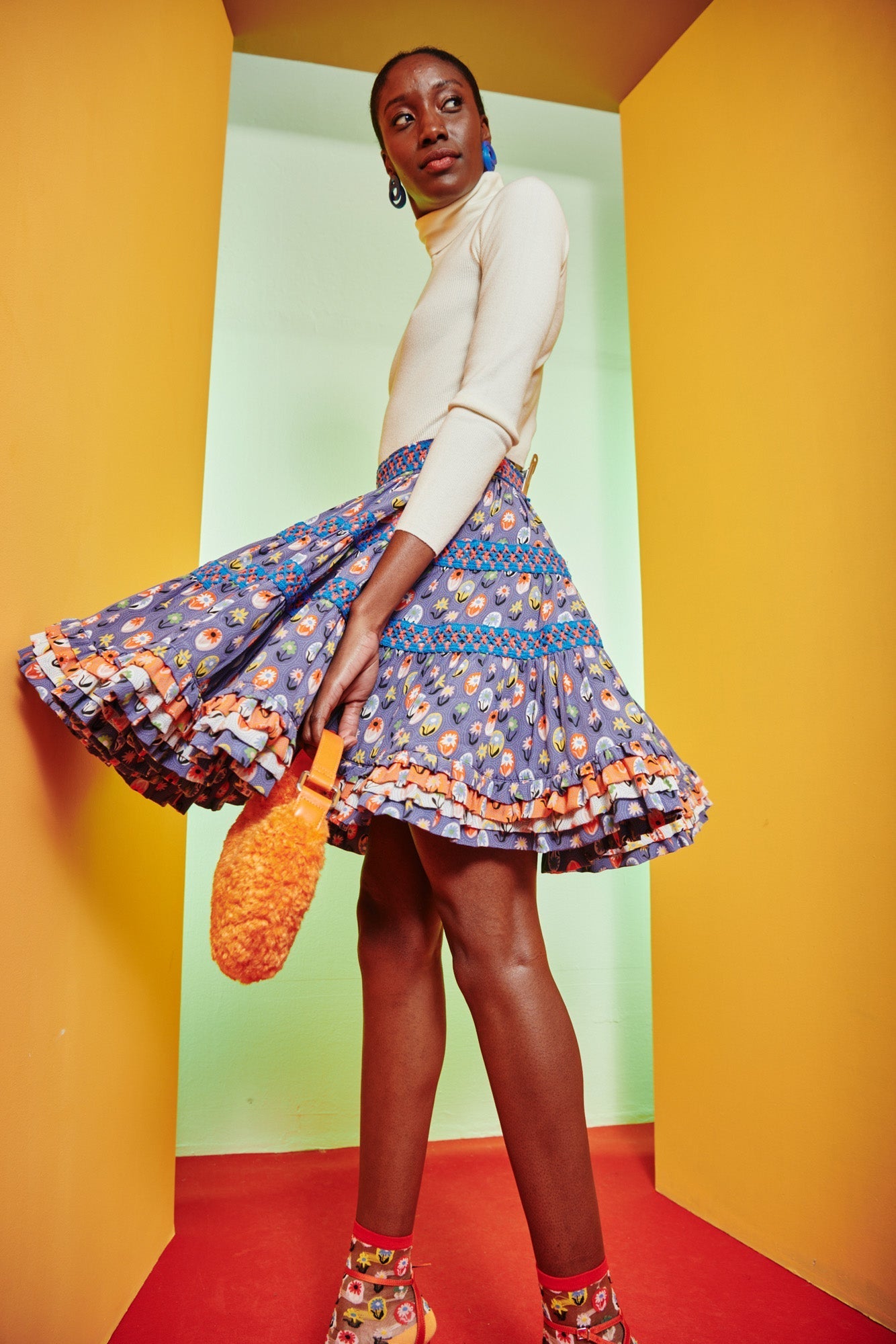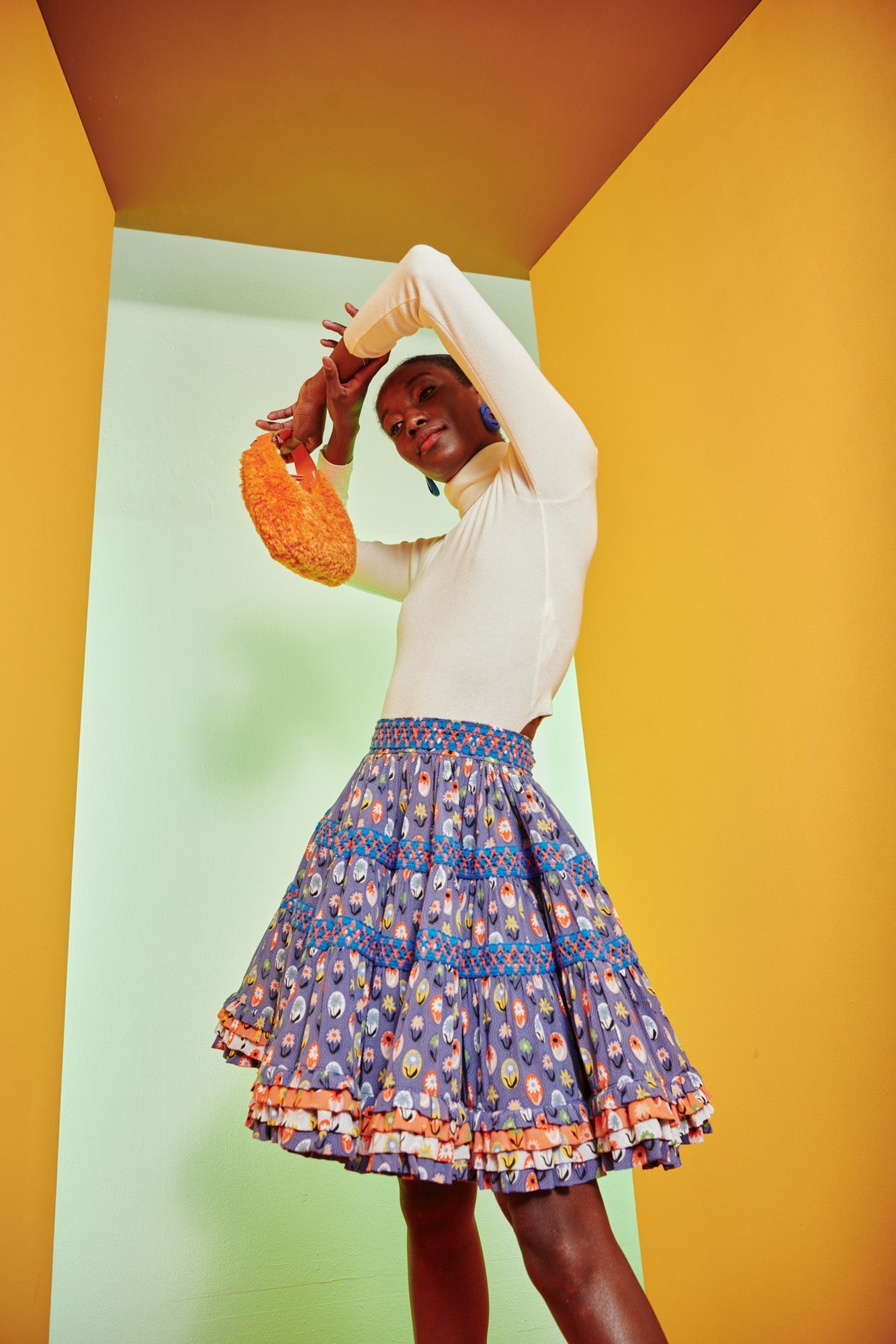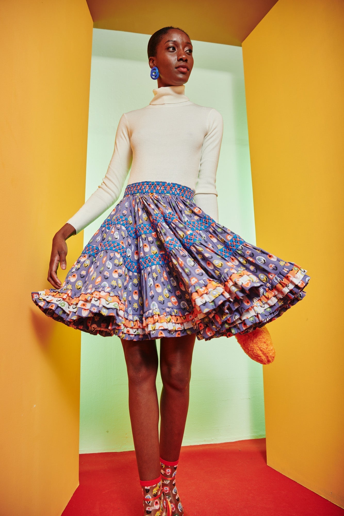 Mini layered ruffled skirt in one of the season's recurring flower prints. With a blue and red ribbon detailing and cinched at the waist. Pair it with the Alice Shirt for a matching look or a white top for a more casual day outfit.