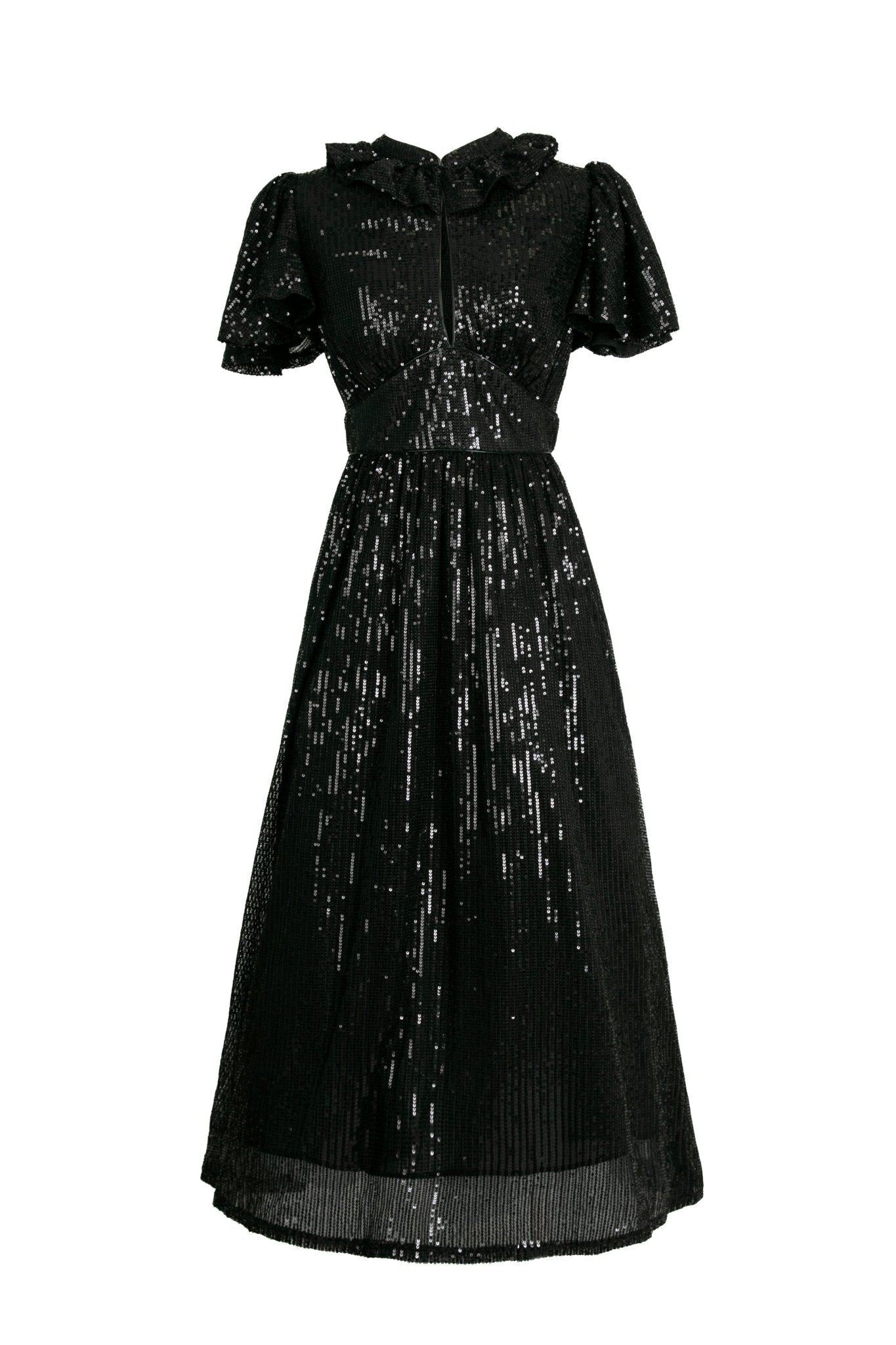 A sweet, midi sequins dress with butterfly sleeves, cinched waist and a flowing skirt. The keyhole detail at the center front will make you feel like the epitome of femininity.