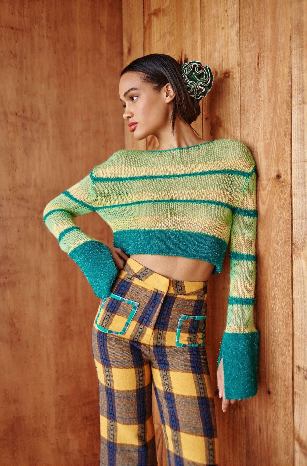 Make a bold statement with our Poppy green cropped jumper. This eye-catching piece features striking green and yellow stripes, perfect for adding a pop of color to your wardrobe. The soft knit fabric ensures a comfortable fit, while the cropped design and long sleeves create a trendy and chic silhouette. Ideal for pairing with high-waisted jeans or skirts, this jumper is perfect for those who love to stand out with fun and colorful fashion choices.