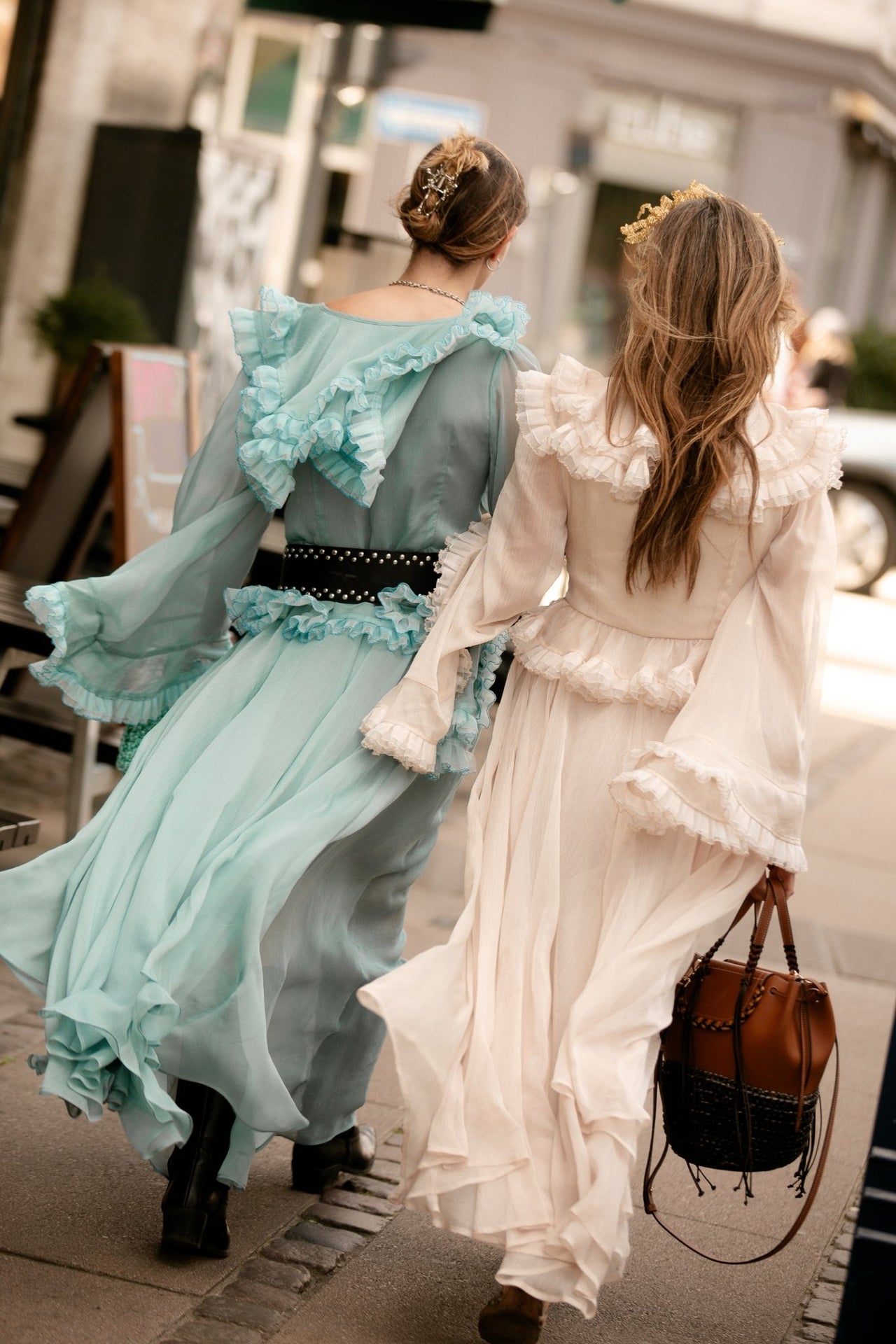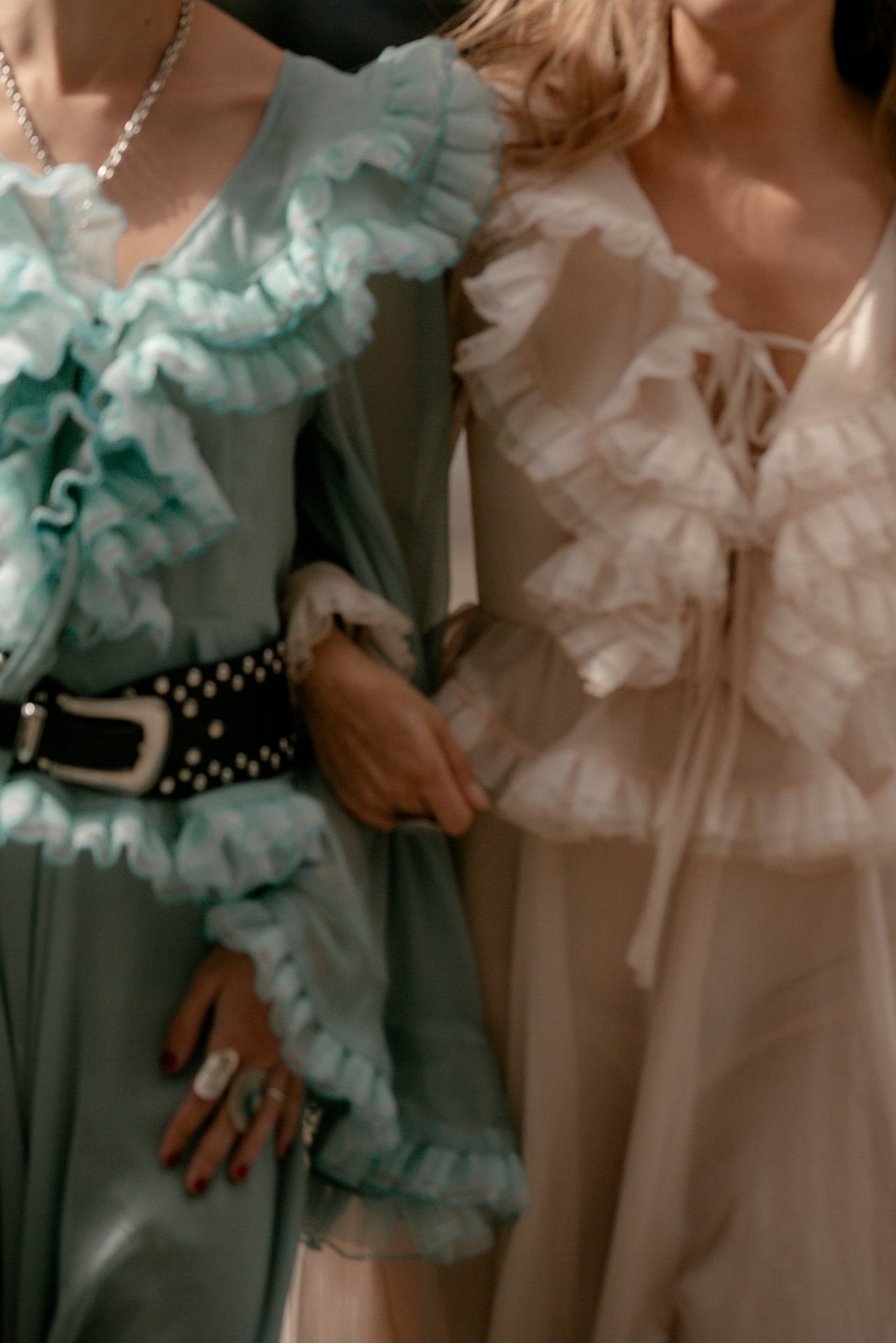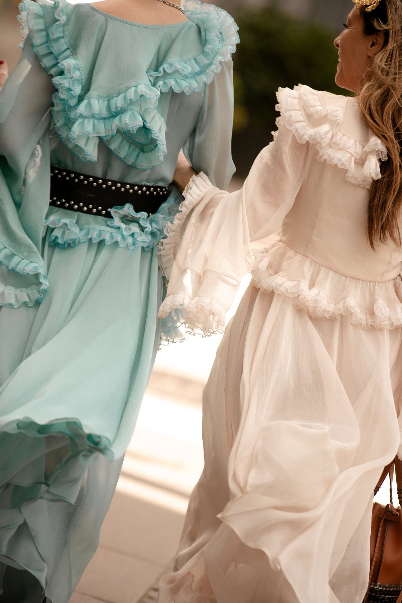 The Bliss Dress floats with ethereal elegance in sheer aqua fabric, layered with romantic ruffles along the neckline and sleeves. Its flowing silhouette creates graceful movement, while the soft transparency adds a dreamy, feminine allure. Perfect for evening celebrations or daytime events that call for effortless sophistication. Side zip.