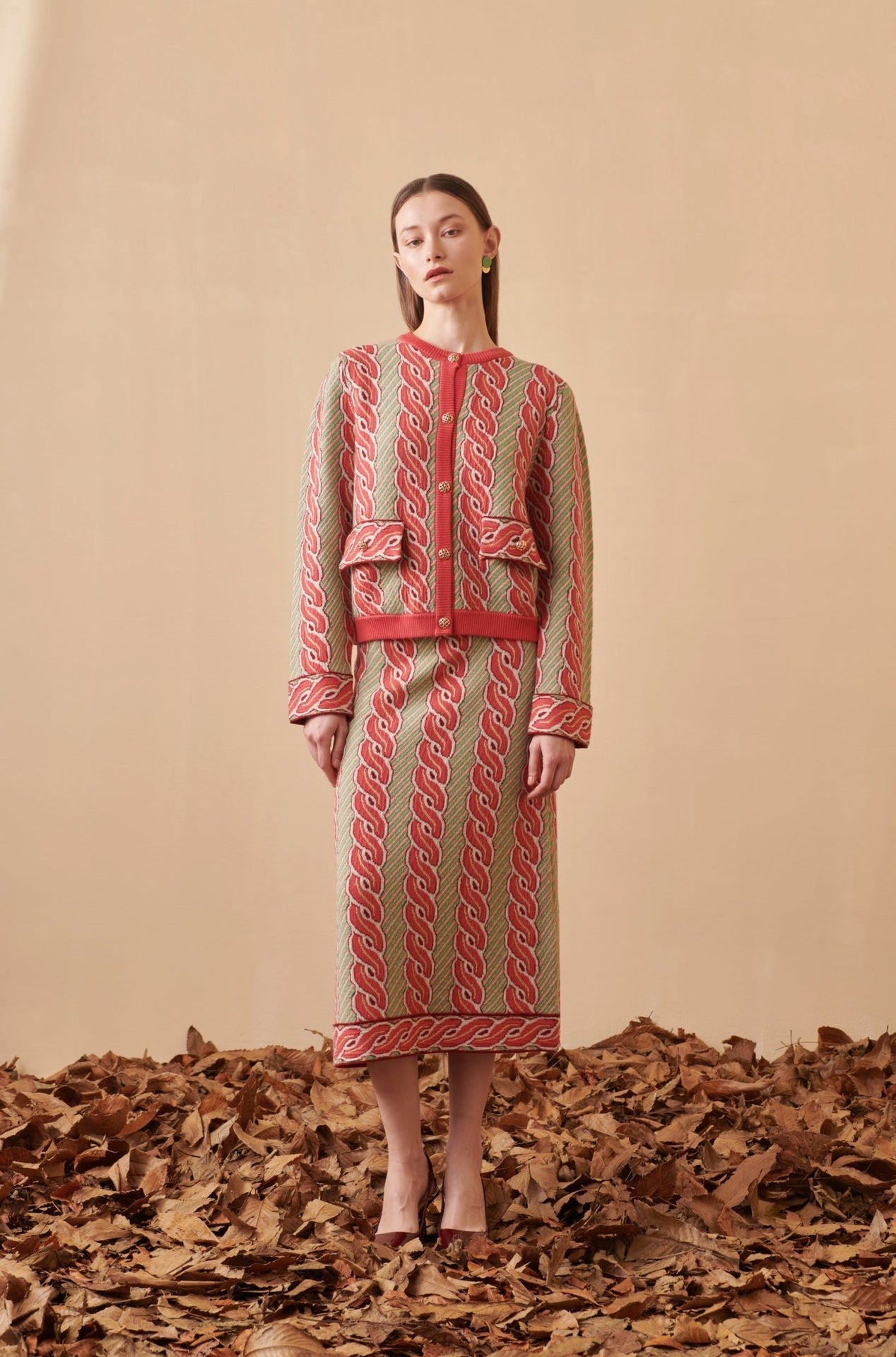 The Lazos Jacket combines graphic pattern and refined tailoring. Crafted in a textured woven fabric, it features vertical rope-inspired motifs in coral and sage green, framed with matching patterned trim along the collar, cuffs, hem, and flap pockets. The boxy silhouette offers a modern, structured fit, making it perfect for pairing with the matching Lazos Skirt or styling over neutral trousers for a patterned pop.
