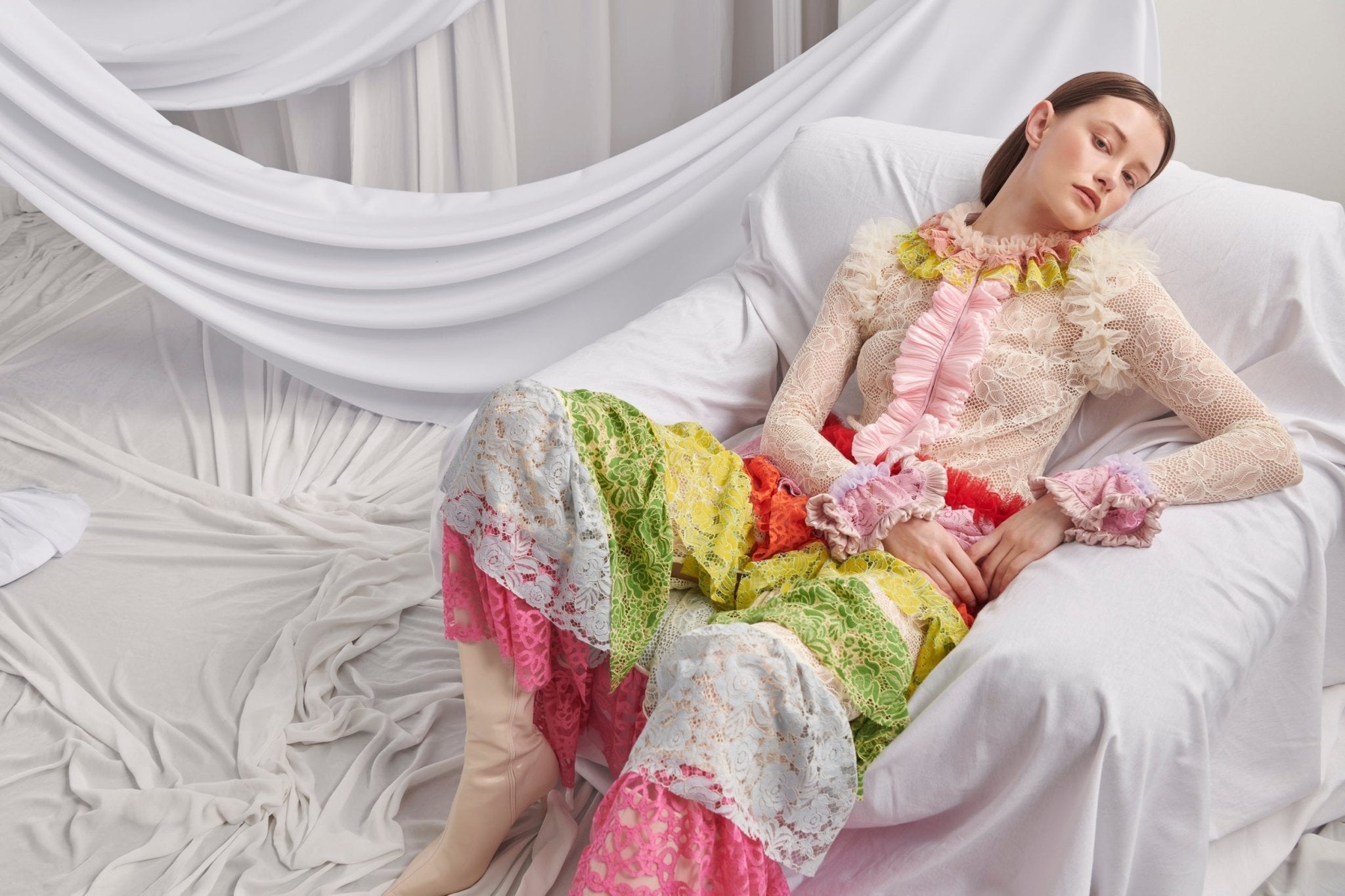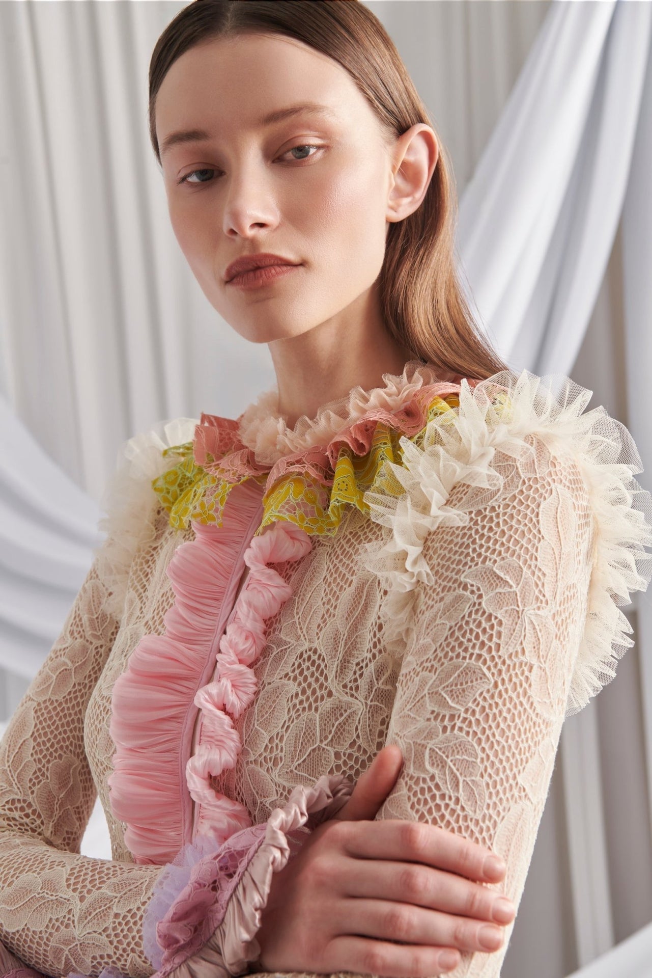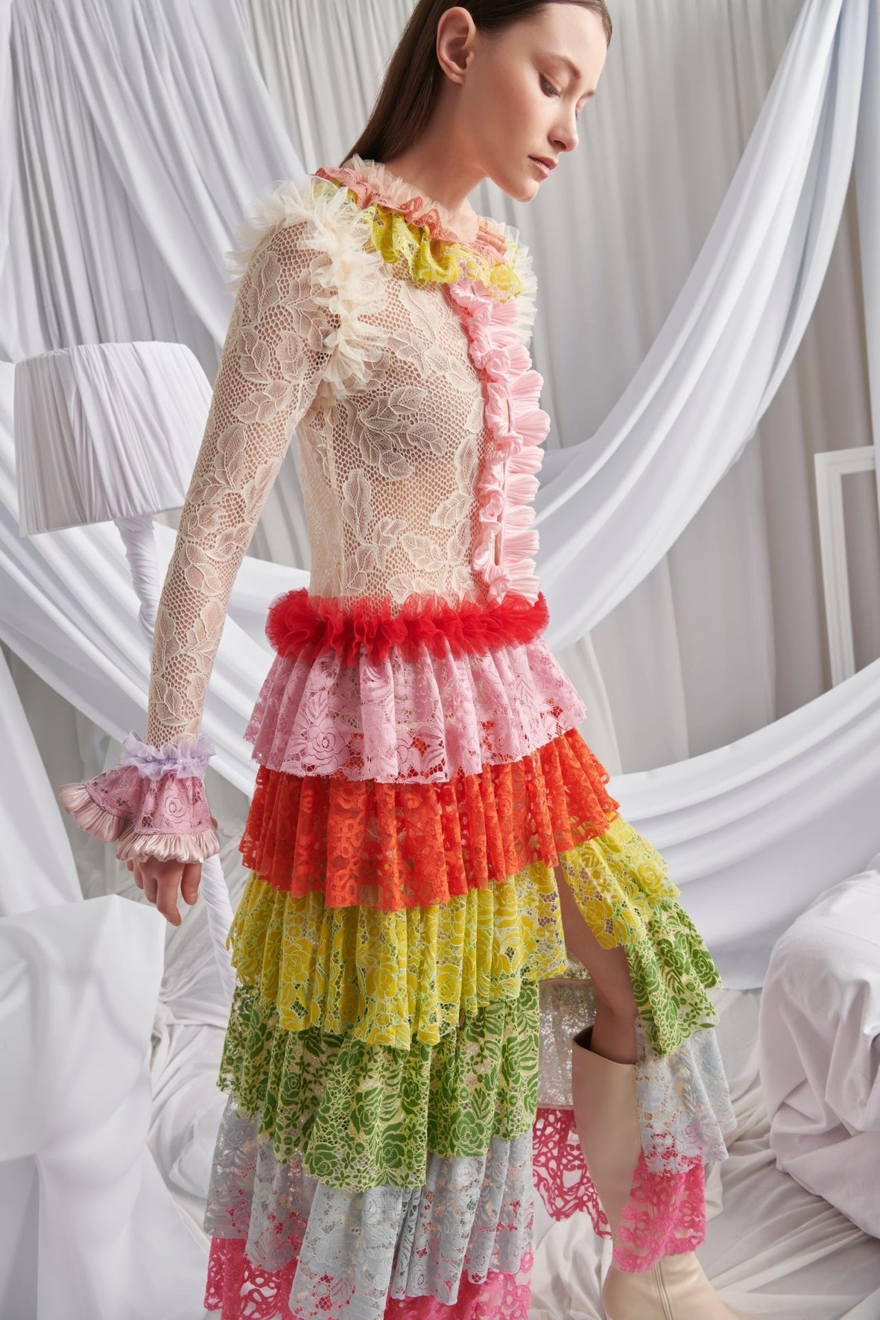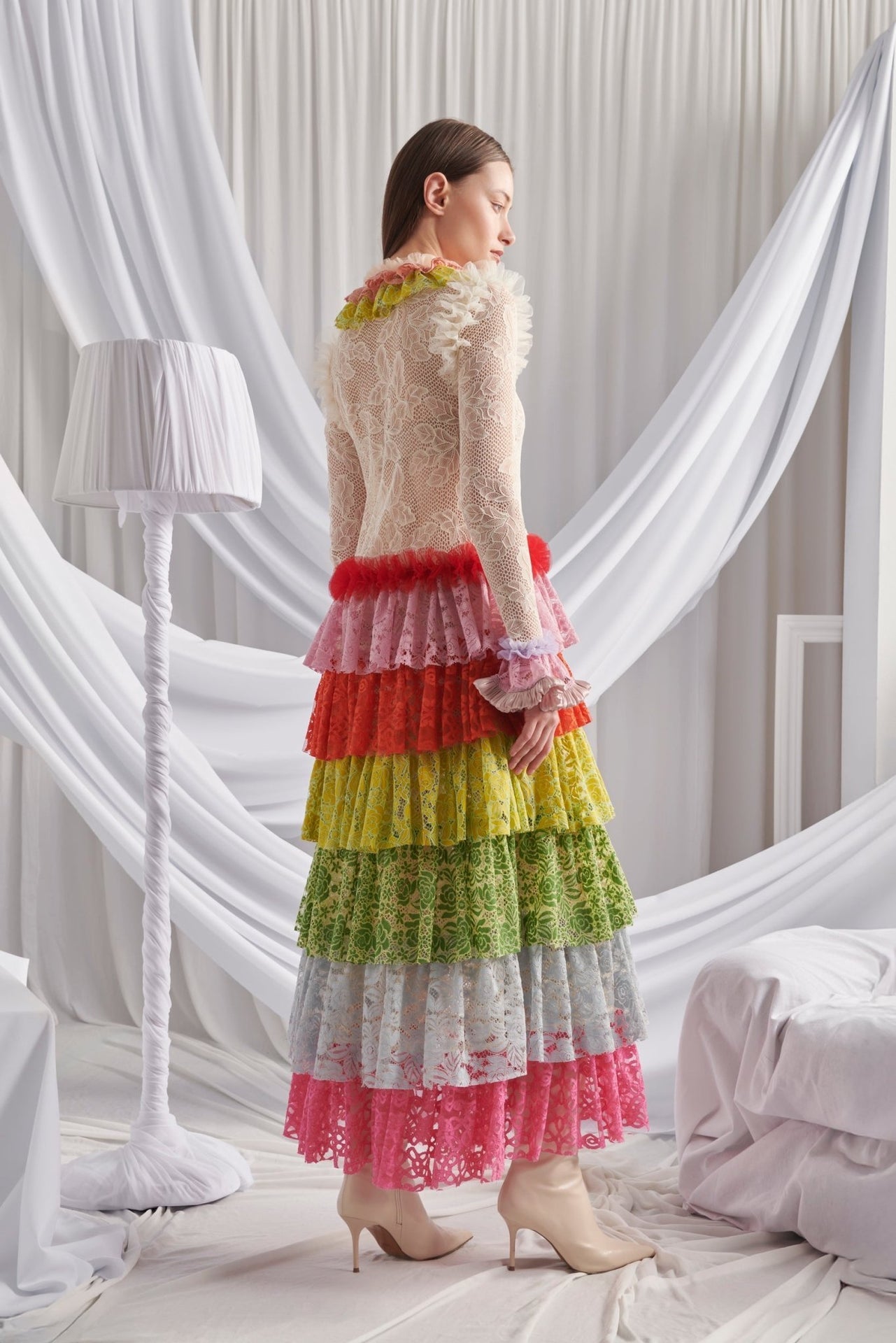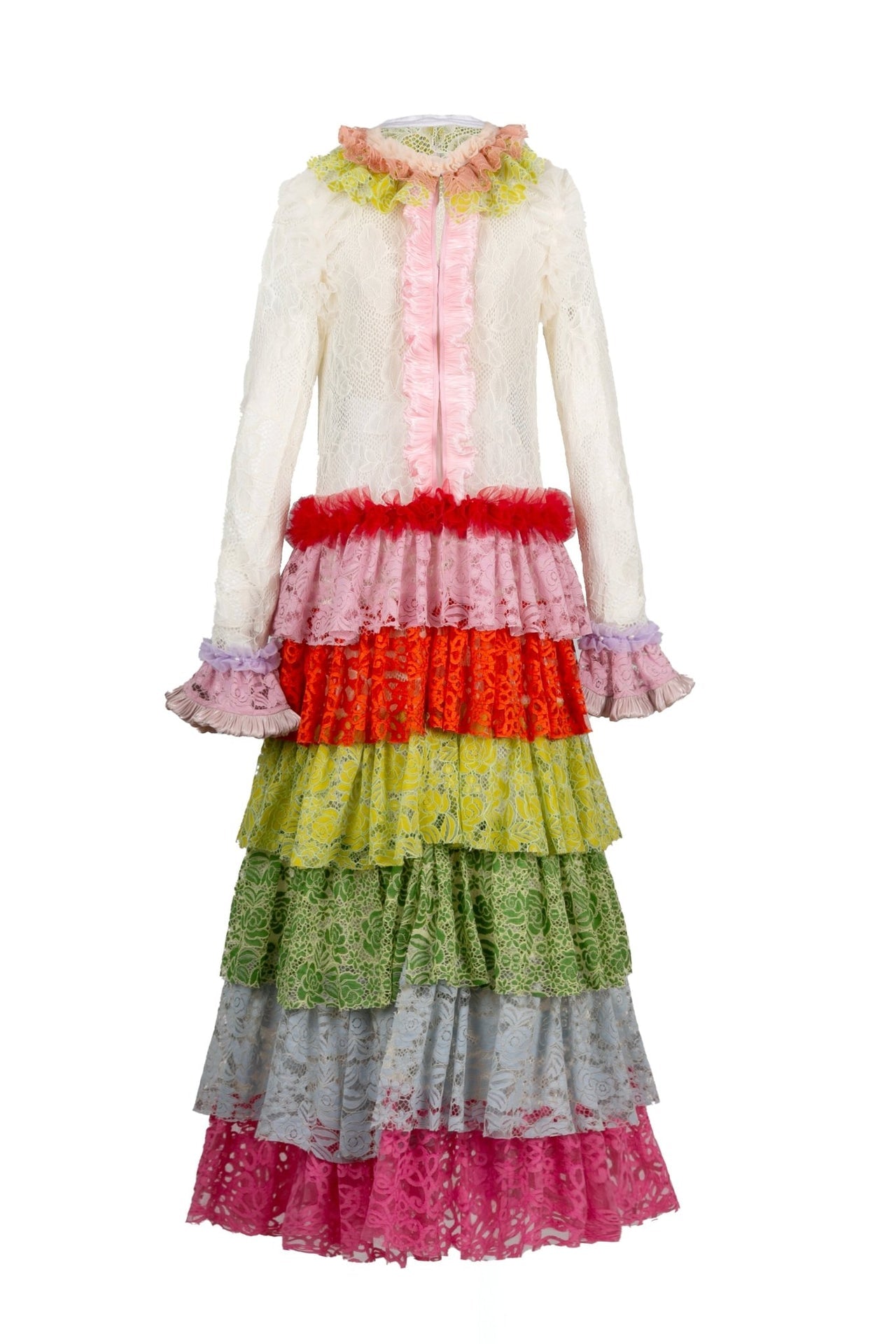 The Alegría Dress brings joyful drama with tiered lace layers in vibrant hues of pink, red, yellow, green, and silver. A romantic high-neck silhouette with ruffled pink and yellow trims completes this statement piece, perfect for celebrations that call for bold color.