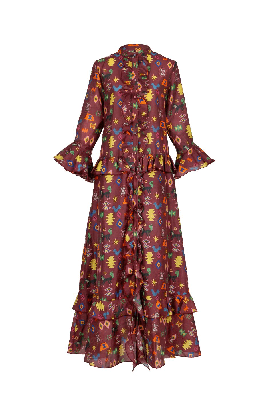 The Delight Dress is a flowing maxi dress crafted in a print that radiates femininity and ease. Designed with flared sleeves, ruffled cuffs, and a belted waist, it creates a flattering silhouette with subtle movement. Its button-down front adds versatility, making it suitable for both everyday elegance and more festive occasions.