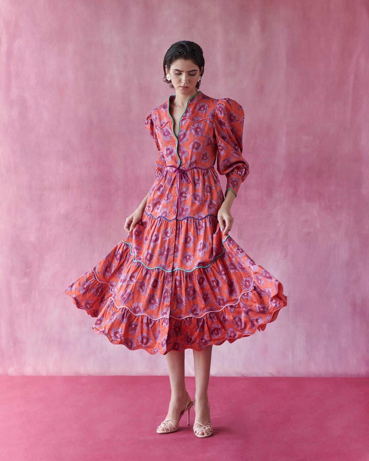 The Hope Dress Print is a reimagined house classic, refreshed with this season’s vibrant floral print. Featuring long puff sleeves, a plunging neckline, and tiered ruffles, it maintains its iconic silhouette while embracing a playful new energy. The waist tie enhances definition, and it's button down nature makes this the perfect piece for a more casual outing.