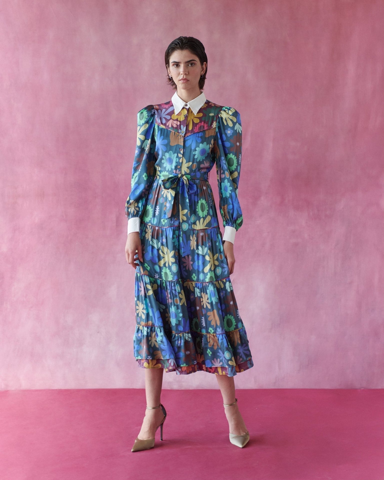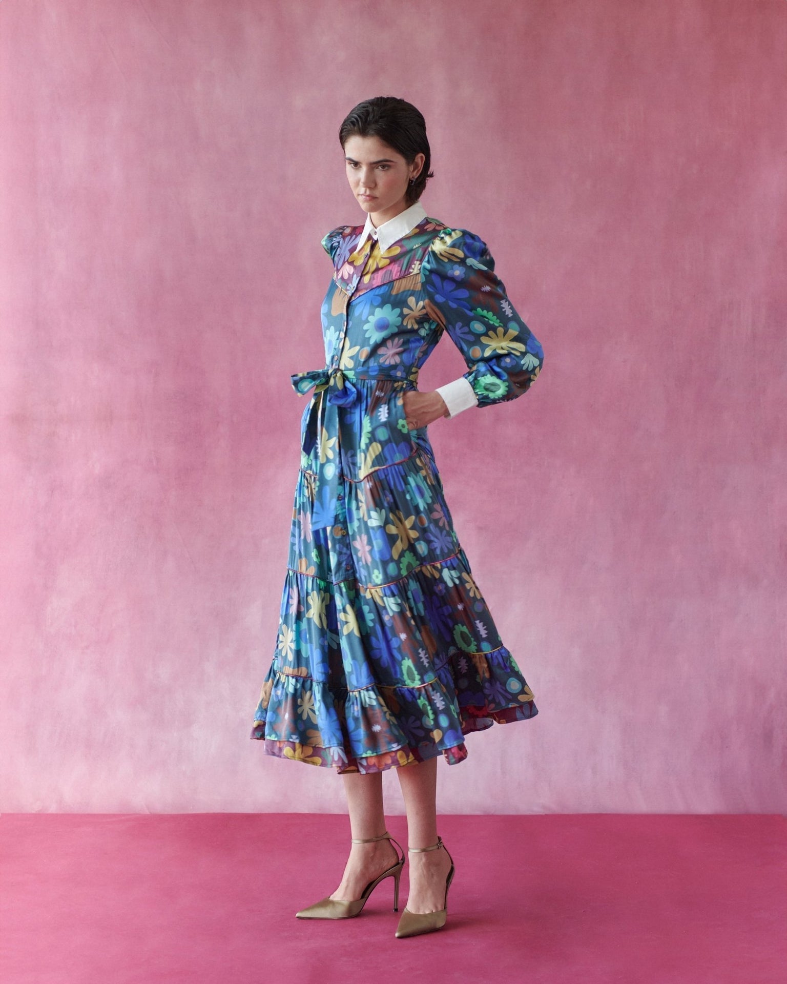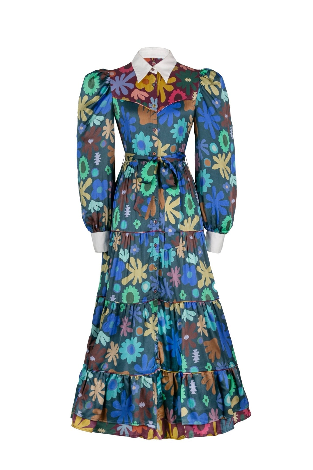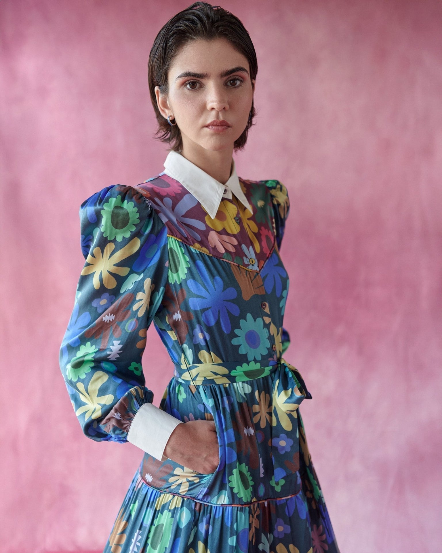 The Jublio Dress is a statement maxi dress with a tailored silhouette. Featuring a crisp white collar and cuffs that contrast against the bold multicolored floral print in blues, it blends elegance with playful vibrancy. The long sleeves and button-down design create a structured look, making it perfect for both polished daywear and chic evening occasions.