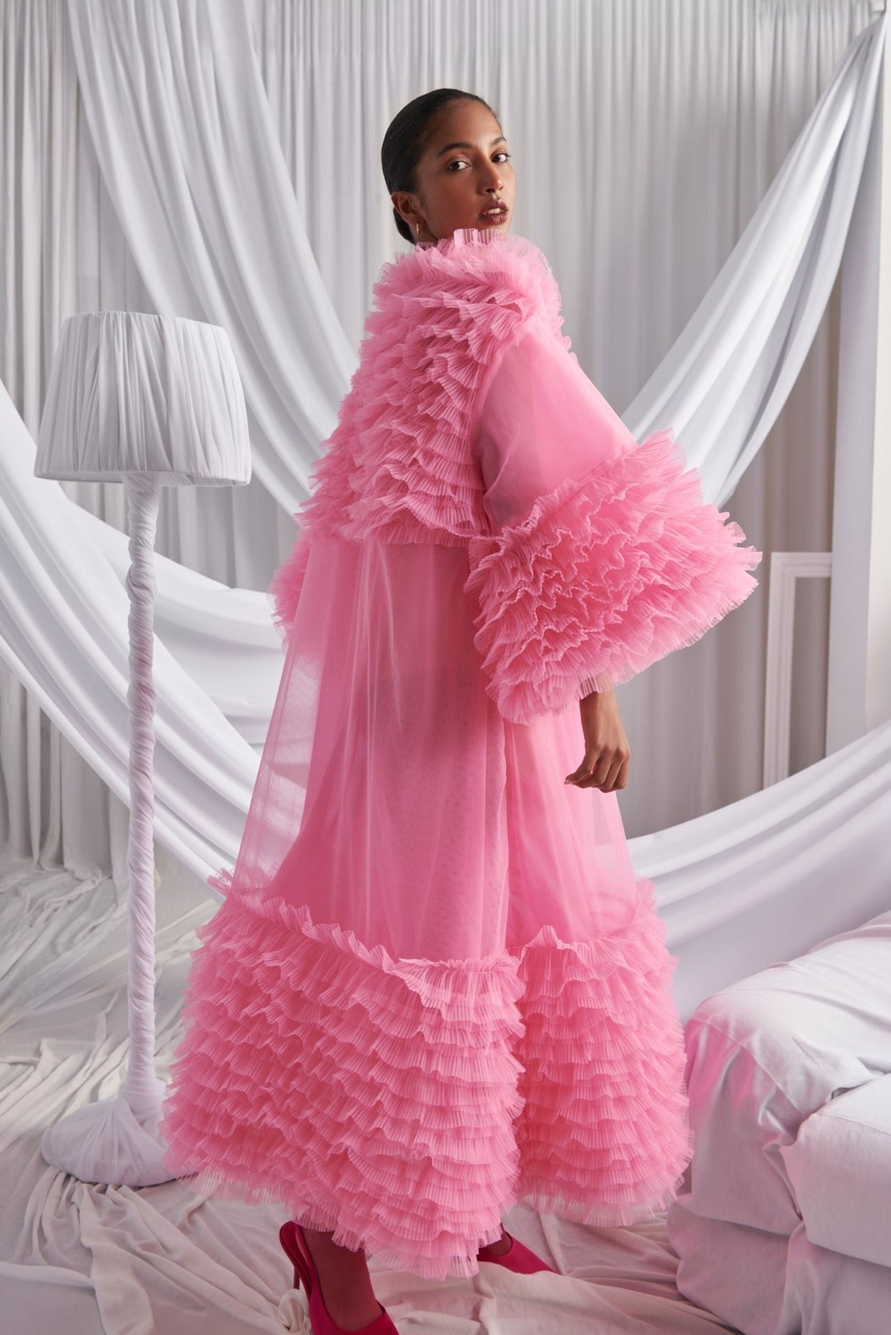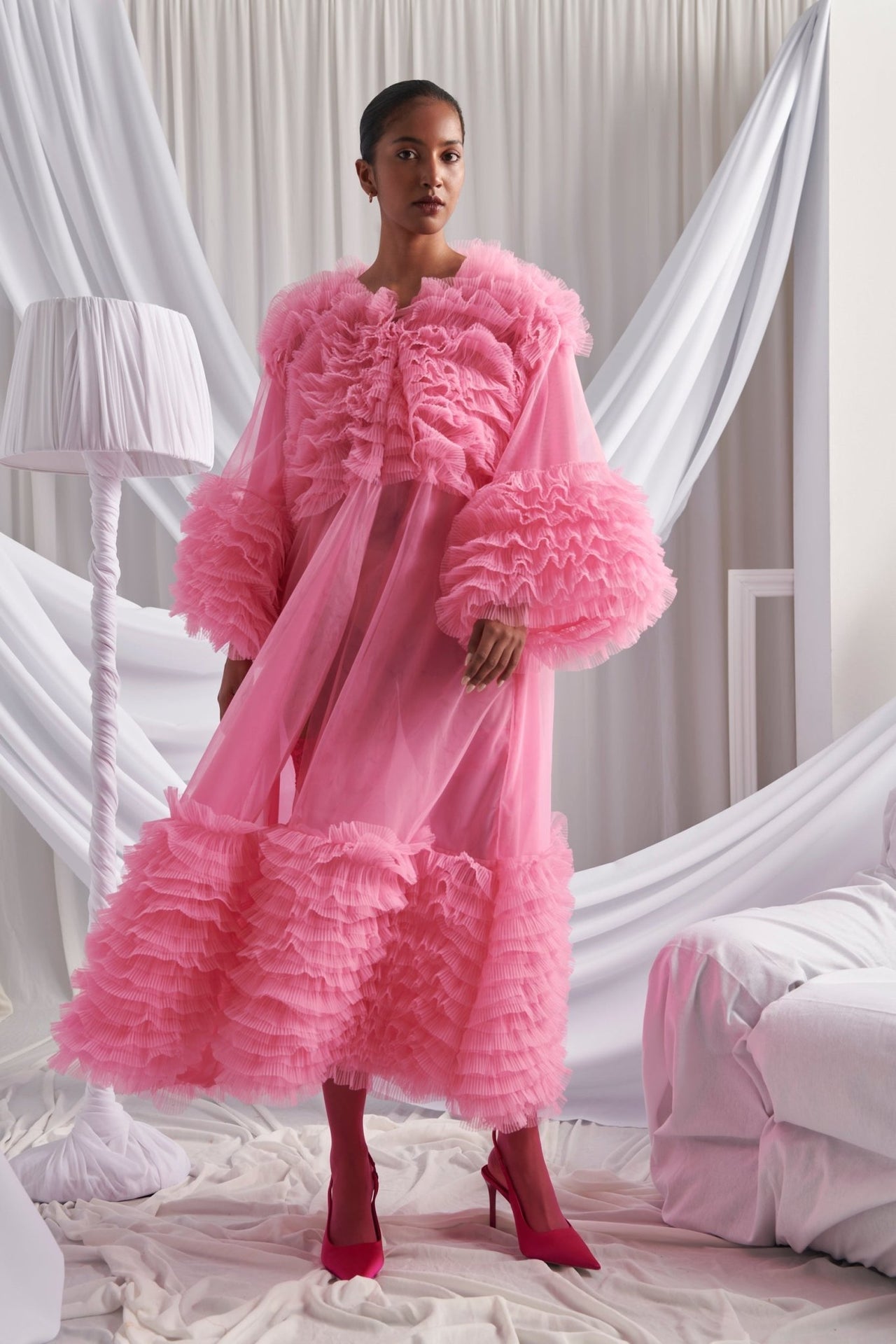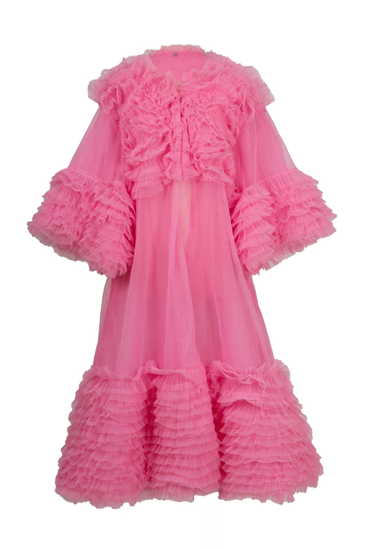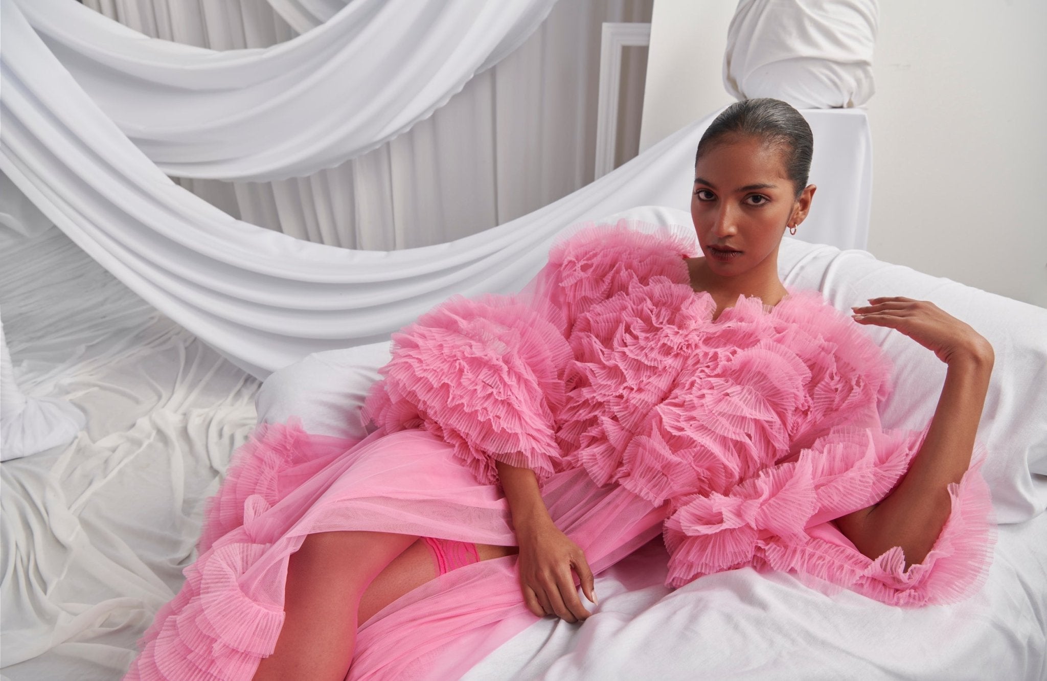 The Luz Dress is a breathtaking vision in vibrant pink tulle, designed for dramatic entrances. Featuring cascading pleated ruffles across the sleeves, hem, and bodice, this voluminous gown balances romance and high fashion. Perfect for galas, red carpet moments, or editorial shoots, it embodies unapologetic glamour.