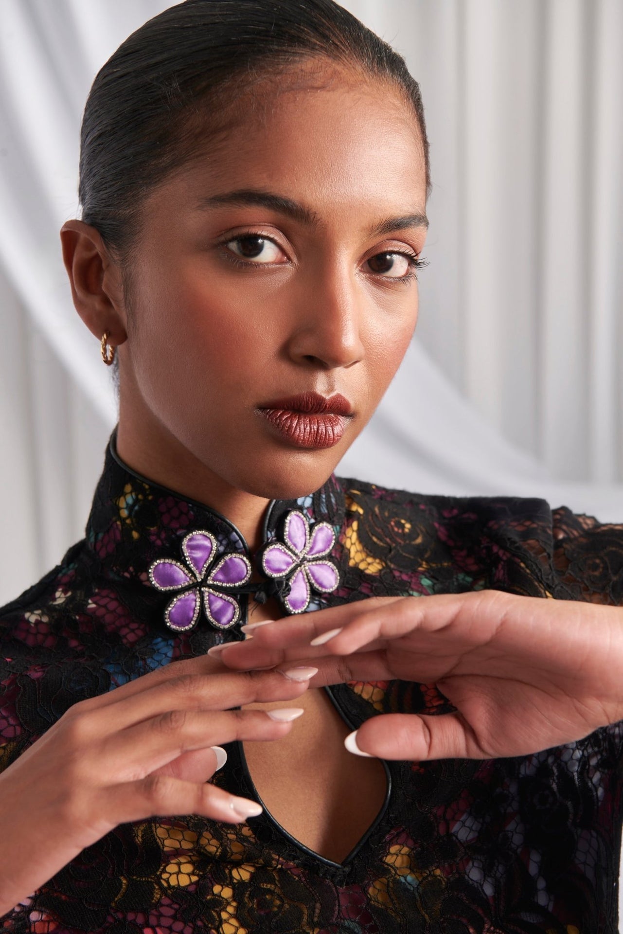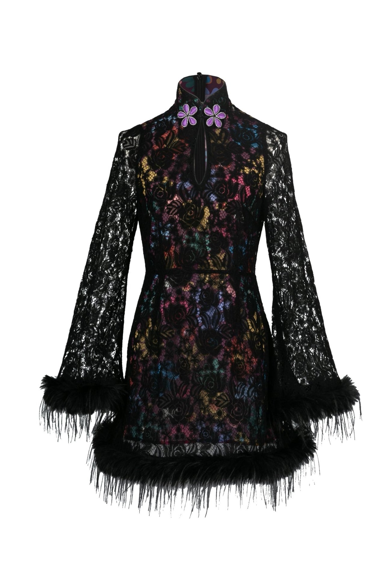 The Lys Dress is a seductive mini crafted in black lace with subtle multicolor accents. Featuring a high collar with floral appliqué, flared sleeves, and feather-trimmed cuffs and hemline, it balances drama and elegance. A statement piece that channels vintage glamour with a modern twist.
