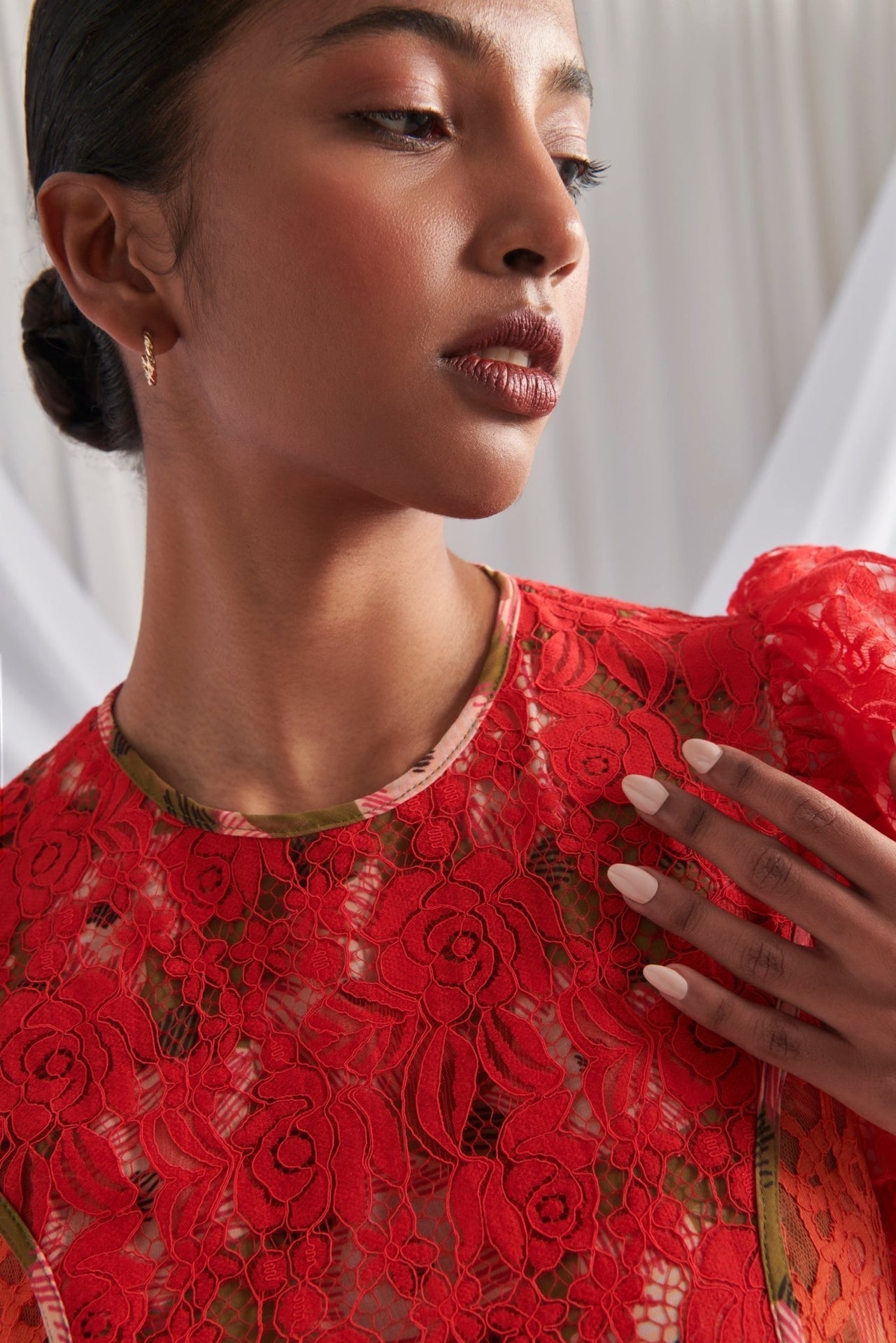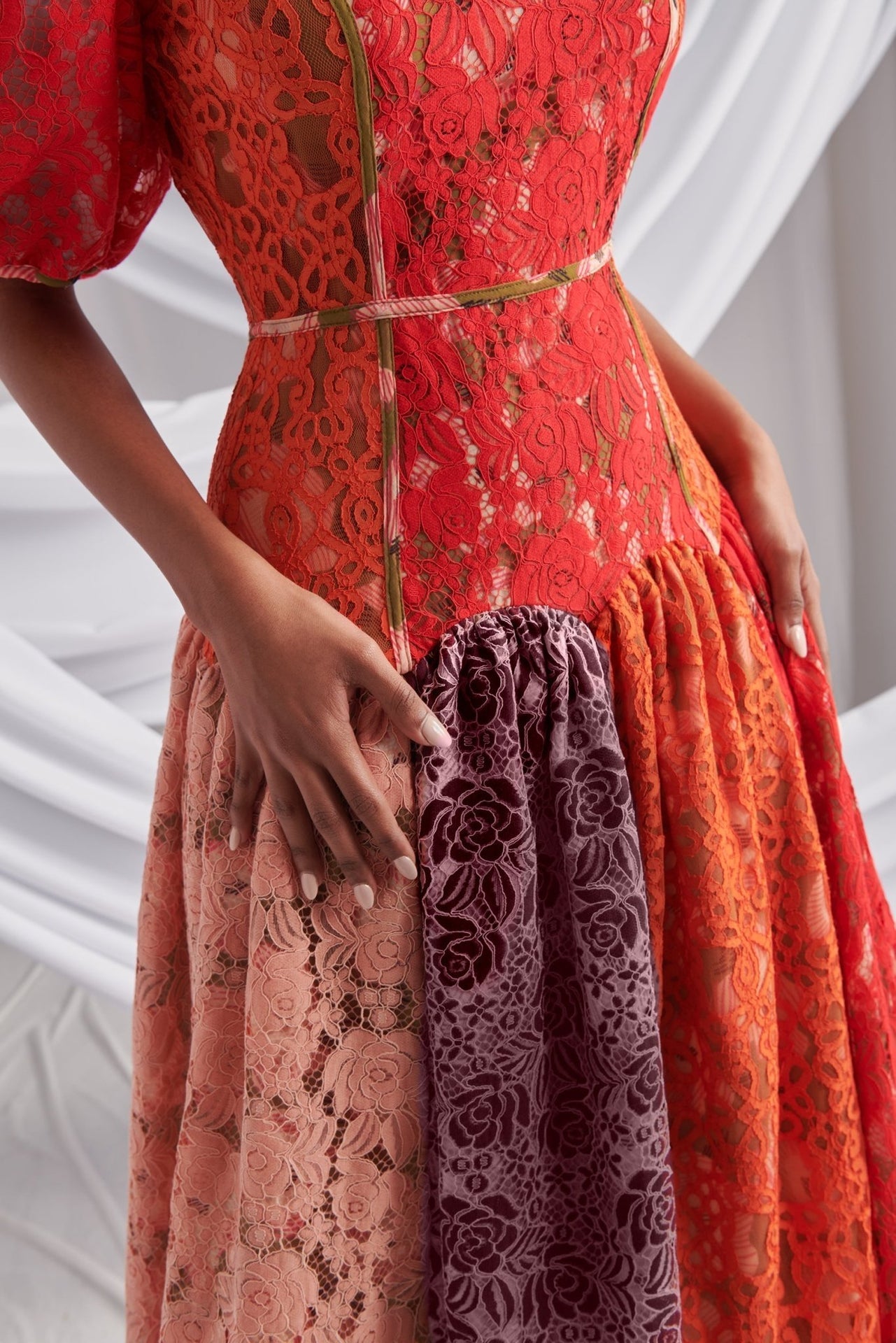 The Philo Dress counts with a bold patchwork of red, orange, and blush. Puff sleeves and a cinched waist create a vintage-inspired silhouette with modern vibrance.