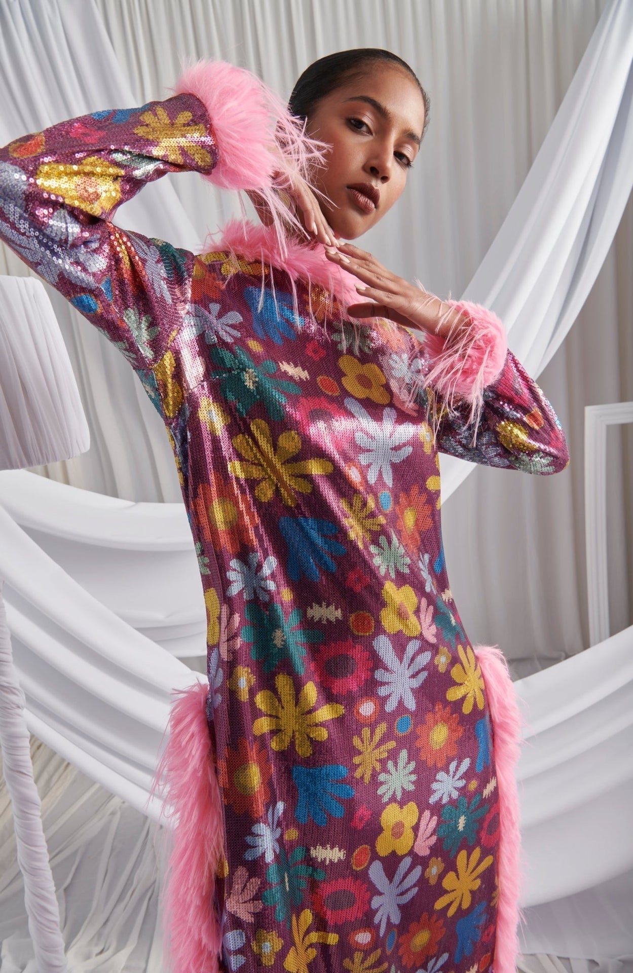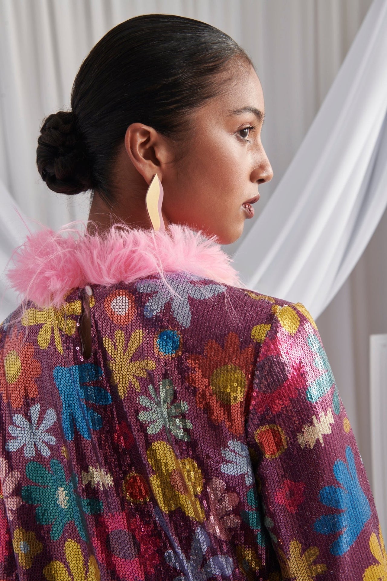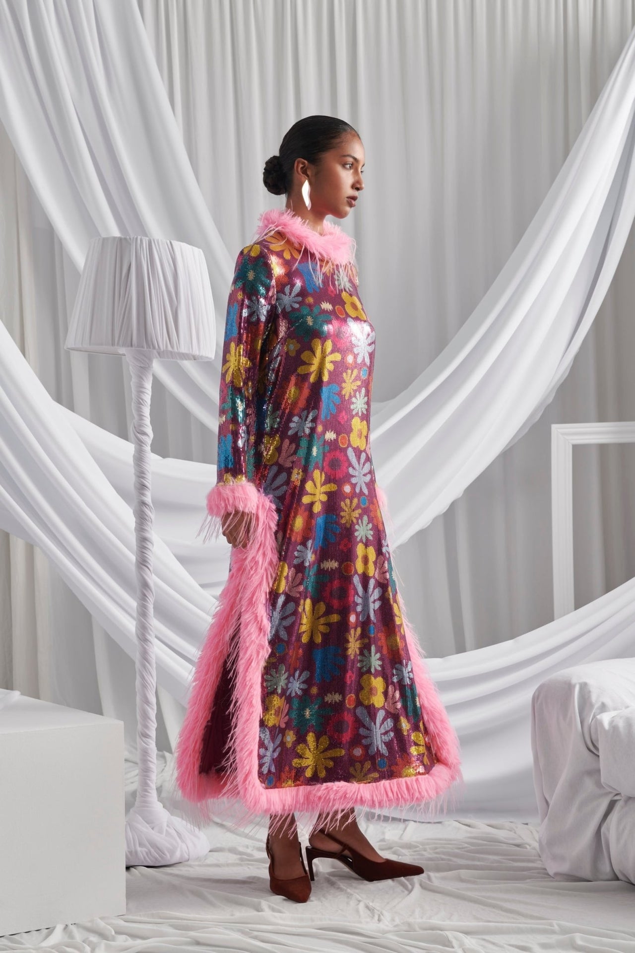 The Rafaella Joy dress reimagines a classic house silhouette with this season’s vibrant floral print. Trimmed with bold pink feather accents along the collar, cuffs, and hem, it’s a playful yet elegant statement piece for day-to-night styling. No pockets, closure via collar loop.