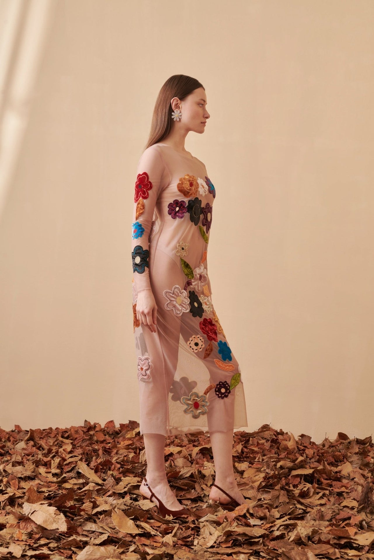 The Romance Dress blends ethereal elegance with vibrant artistry. Crafted in a nude mesh, it’s adorned with oversized floral appliqués in rich jewel tones, pastels, and velvety textures, creating a garden-like cascade across the body. The slim, long-sleeved silhouette skims the figure for a refined yet whimsical effect. A show-stopping choice for evening events, gallery openings, or fashion-forward winter occasions.