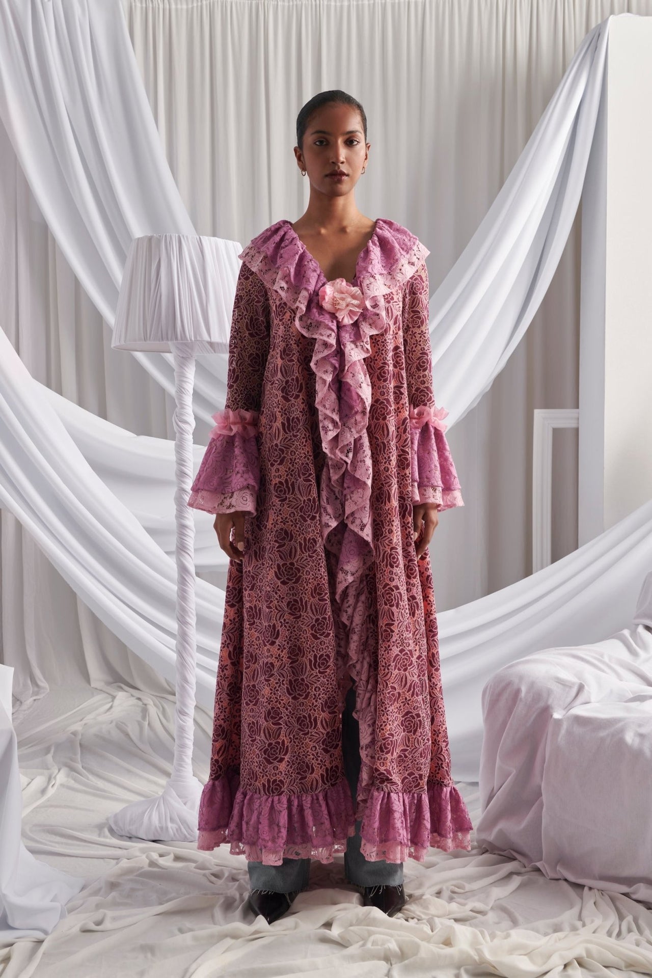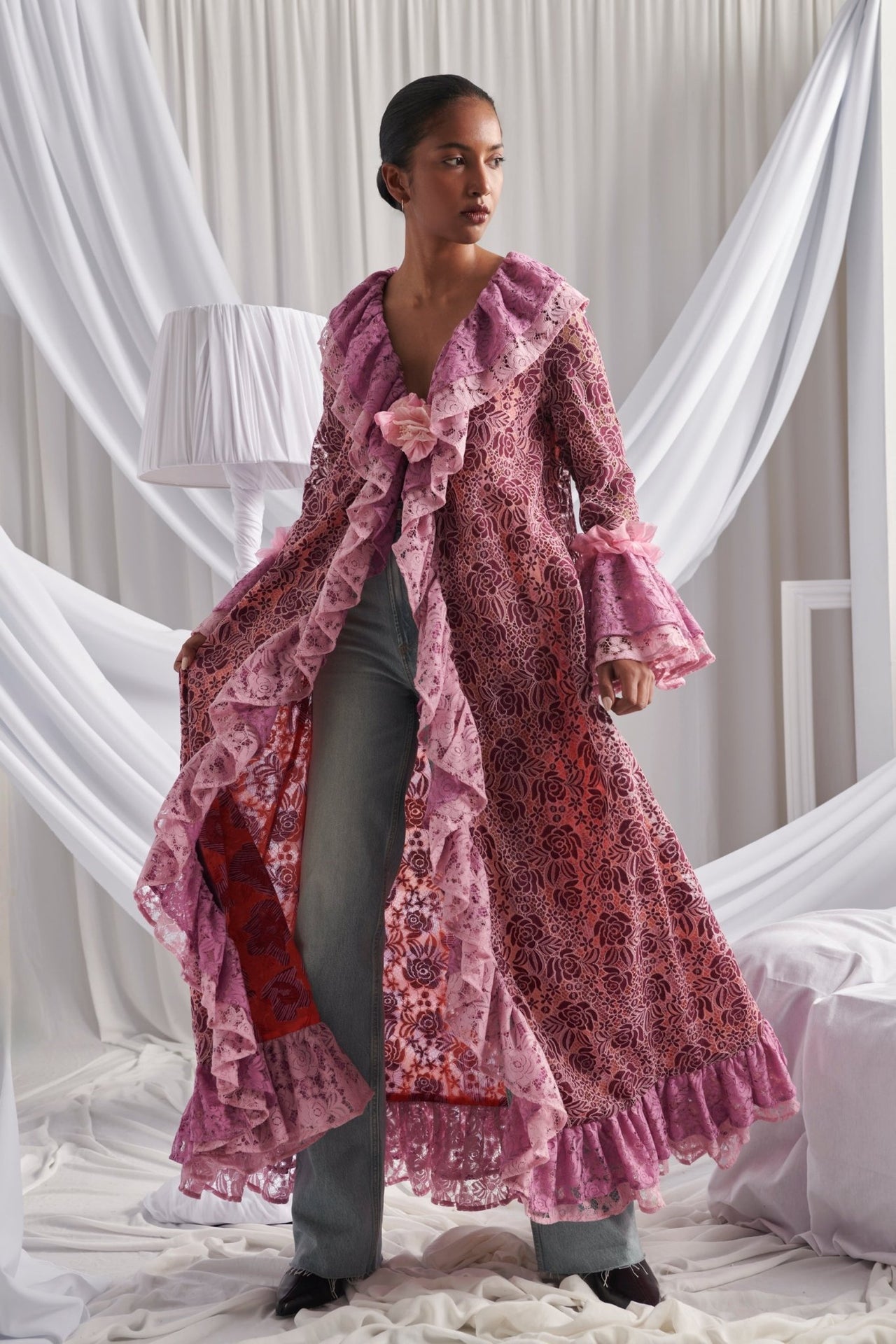 The Sparkle Kaftan is a glamorous layering piece crafted in shimmering pink lace with cascading ruffles. Styled open or closed, it adds a dramatic touch over dresses or pants, combining versatility with elegance. Closure with a frront hook, and the flower is a detachable pin.