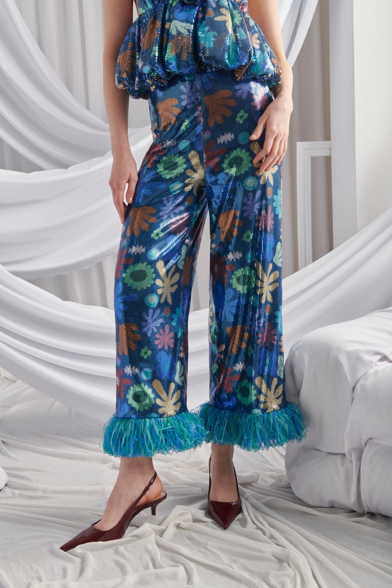 The Luce Pants bring effortless glamour with a wide-leg cut and this season’s striking floral print in blue tones. Finished with turquoise feather trim at the hem, they balance playful detail with elegant flow. Pair with the Luce Top for the full set.