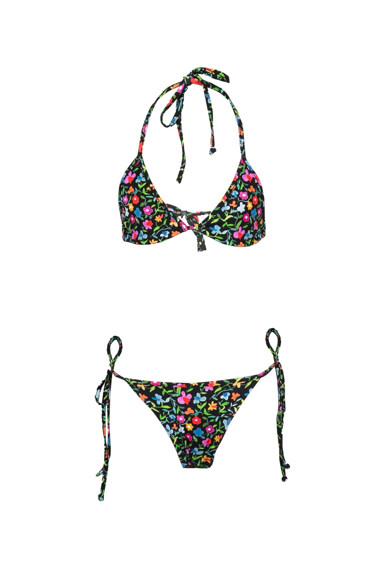 Playful and classic in equal measure, the Antares Swimsuit is your go-to bikini for sun-drenched days. The black base is scattered with colorful, retro-inspired floral prints that pop against your summer glow. The triangle top ties at the neck and back for a customizable fit, while the side-tie bottoms adjust easily to your comfort. Can be worn on both sides.