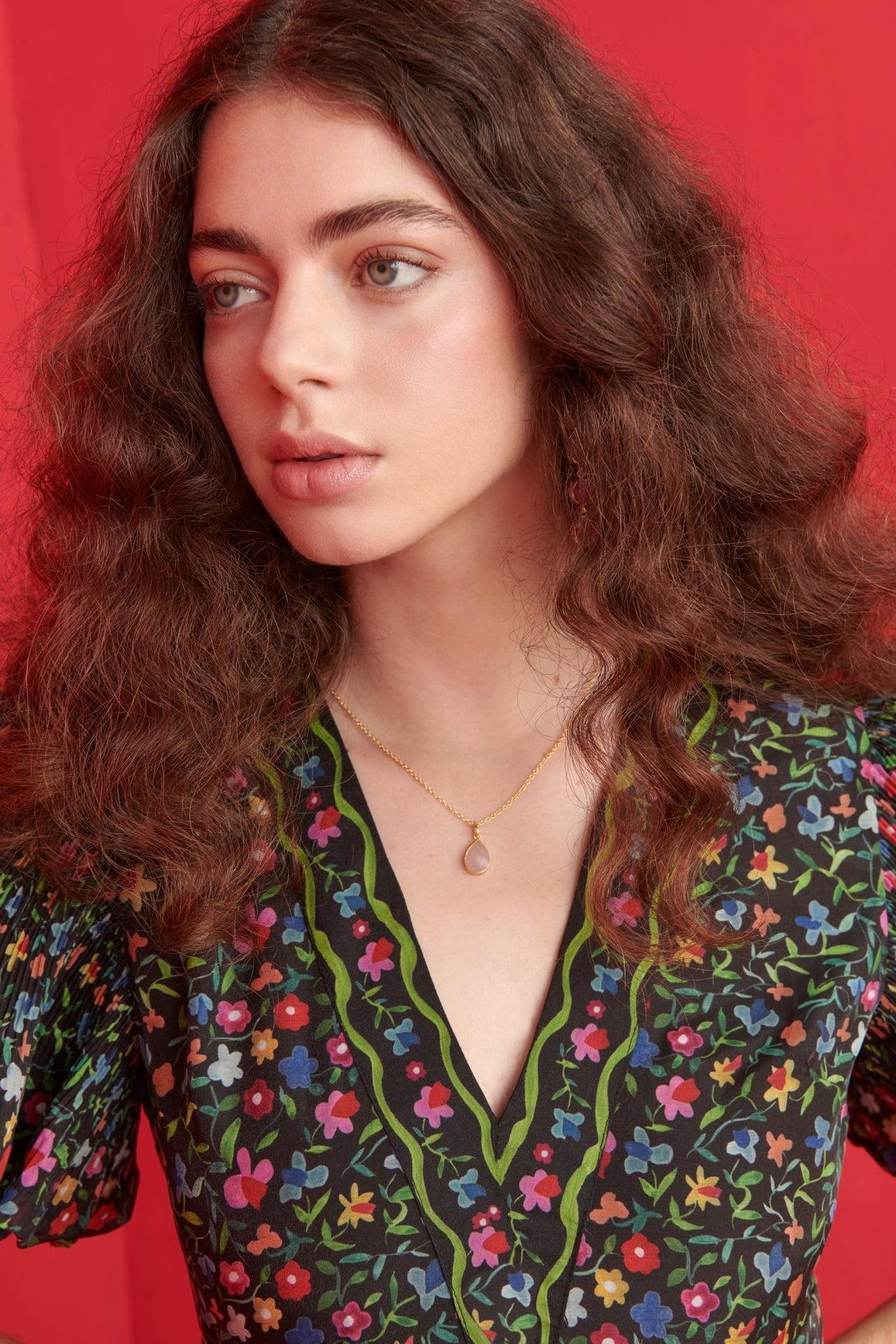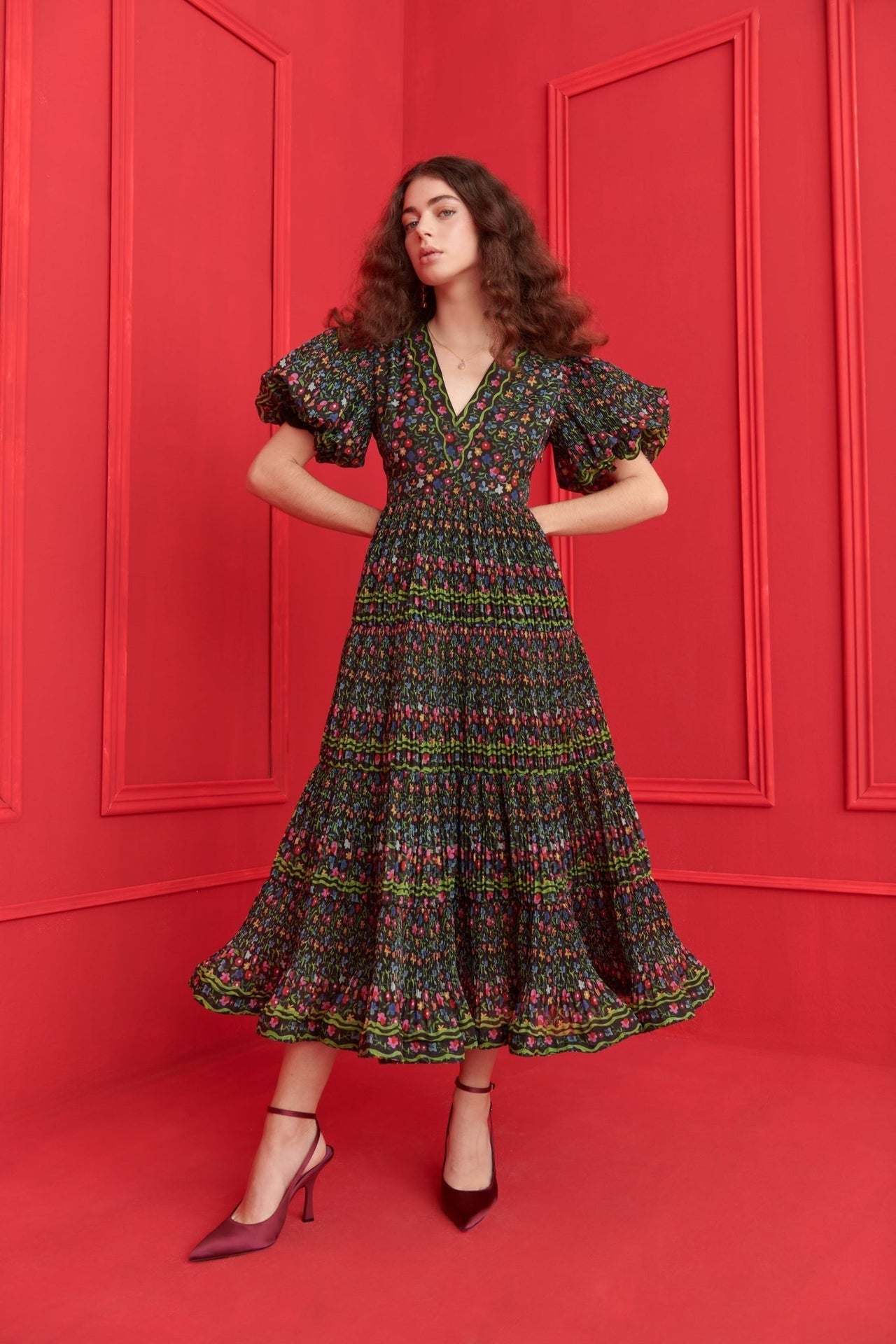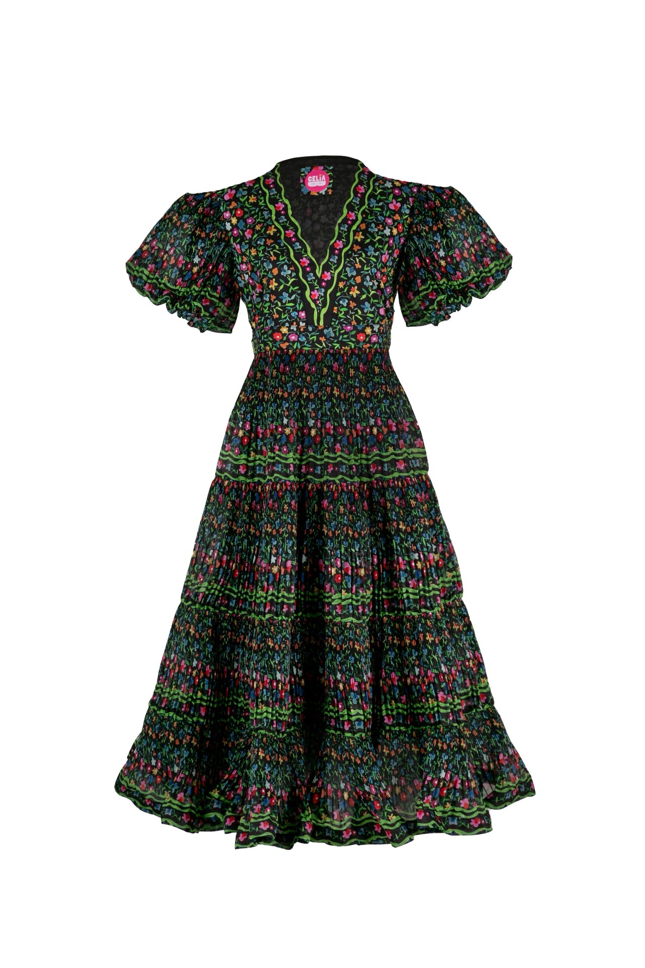 A romantic flourish of florals and flair. The Celestia Dress stands out with its dreamy puff sleeves, gathered skirt, and all-over smocked texture that flatters every shape. The deep V-neckline and vibrant floral pattern over black infuse it with folk-inspired charm, while the detailed belt adds a final touch of artisanal magic. Side pockets add effortless practicality without compromising the silhouette. Designed to move with you and turn heads wherever you go.