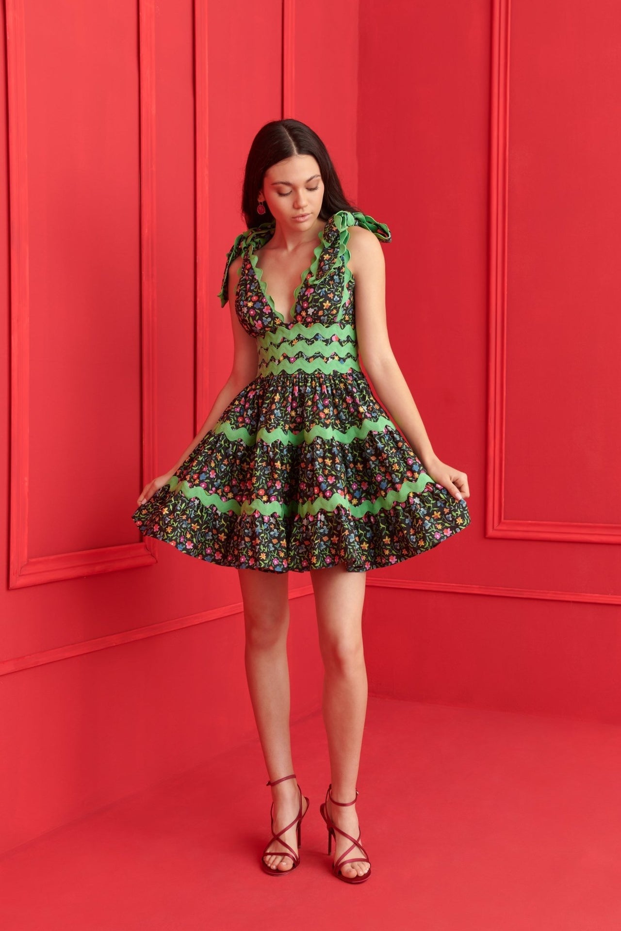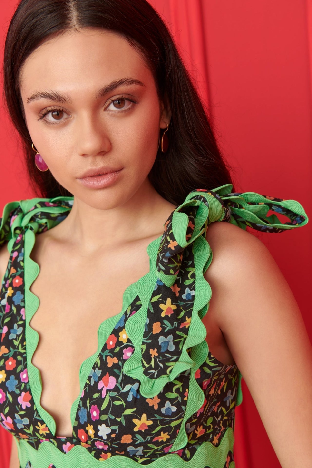 Fun, fearless, and full of flair. The Cheli Dress in Midnight is an ode to summer nights, featuring vibrant green ric-rac trim and a kaleidoscopic floral print. Its tiered skirt and flattering V-neckline create a silhouette full of movement and charm. With adjustable tie straps at the shoulders, it’s perfect for dancing the night away or brightening up a daytime stroll.