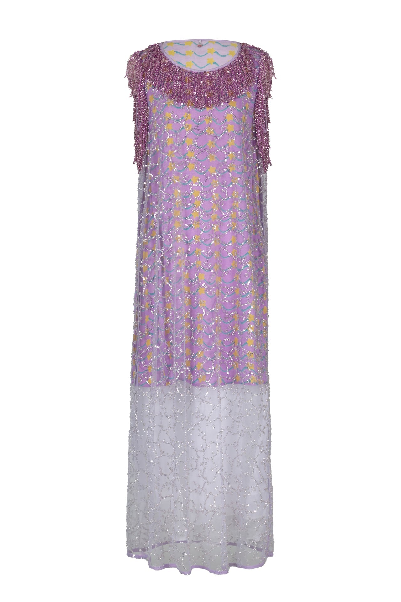 Float into the night in the ethereal Lunaria Dress. This sleeveless sheer midi dress is embellished with shimmering beads and sequins, layered over a pastel lilac base with whimsical floral motifs. Its delicate transparency creates a dreamlike silhouette — perfect for elegant soirées, weddings, or special events where you want to sparkle subtly, yet undeniably.