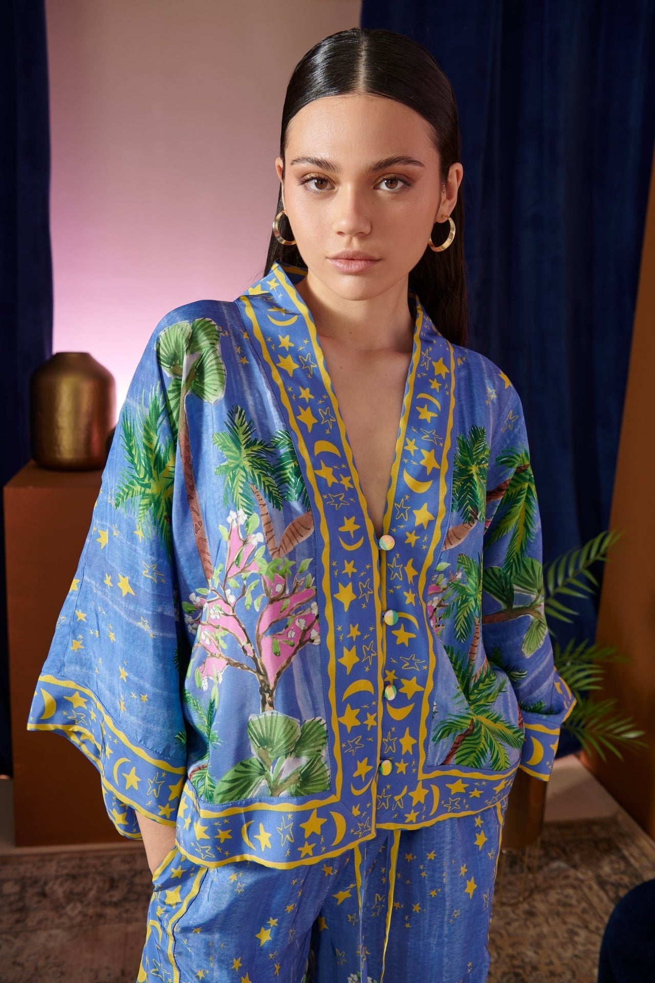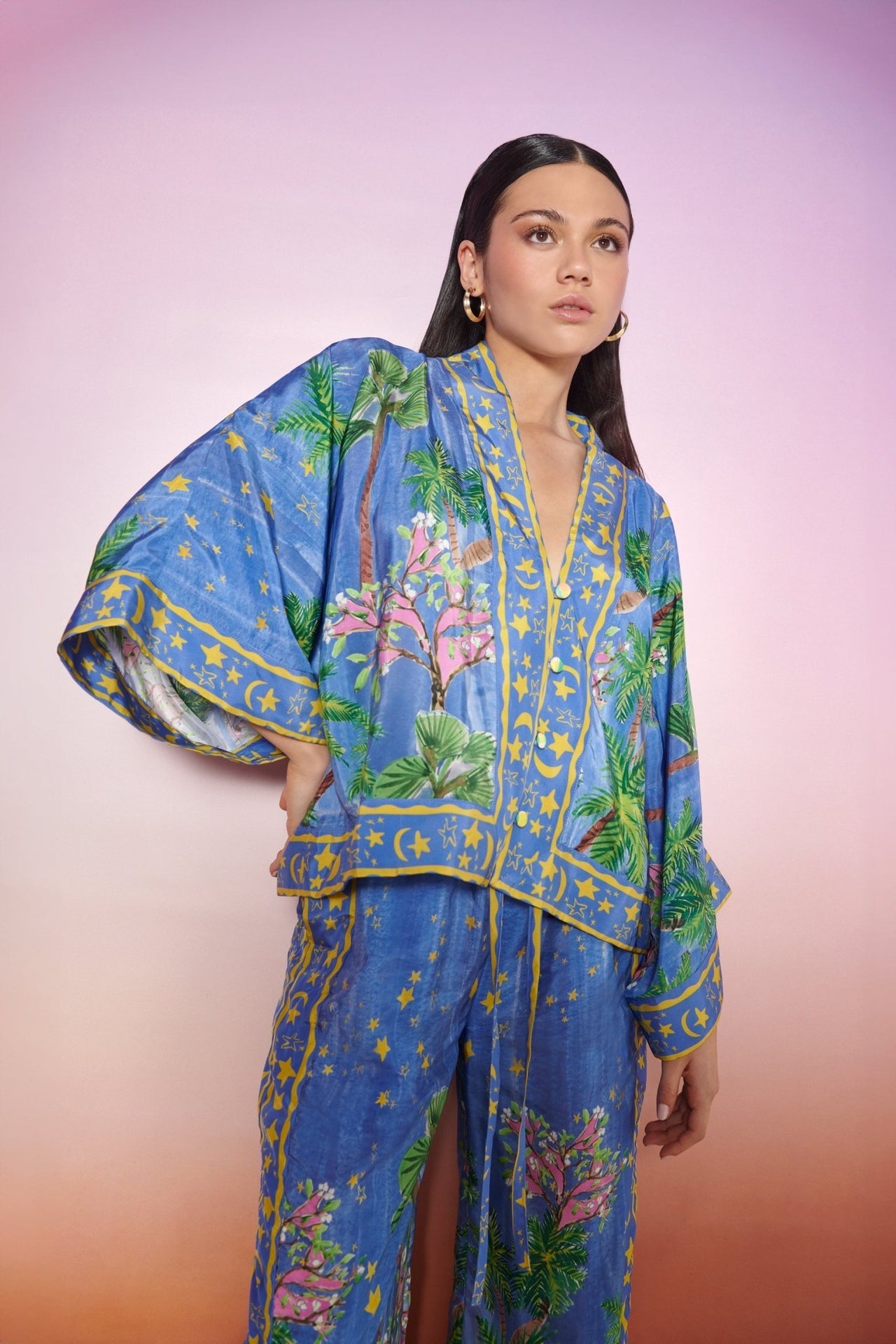 The Noche Set is your go-to for laid-back glamour. Inspired by celestial dreams and tropical escapes, this two-piece ensemble features a relaxed-fit kimono top and wide-leg trousers crafted from silky fabric. The deep blue base is adorned with lush palms, pink florals, and a golden border of stars and moons. Wear it as a statement set or mix and match for effortless elegance — perfect for slow mornings, sunset cocktails, or starry nights in.