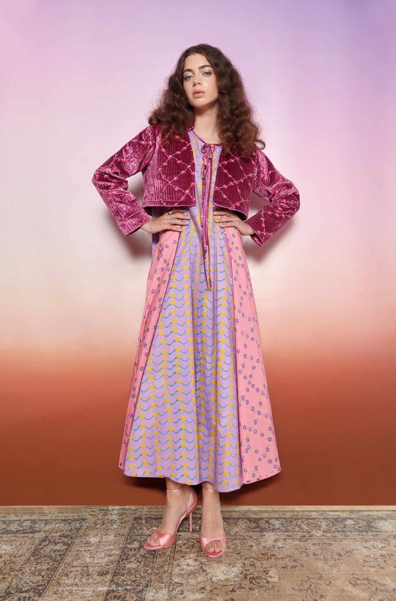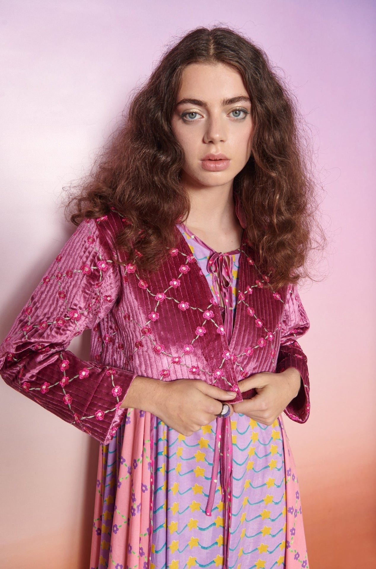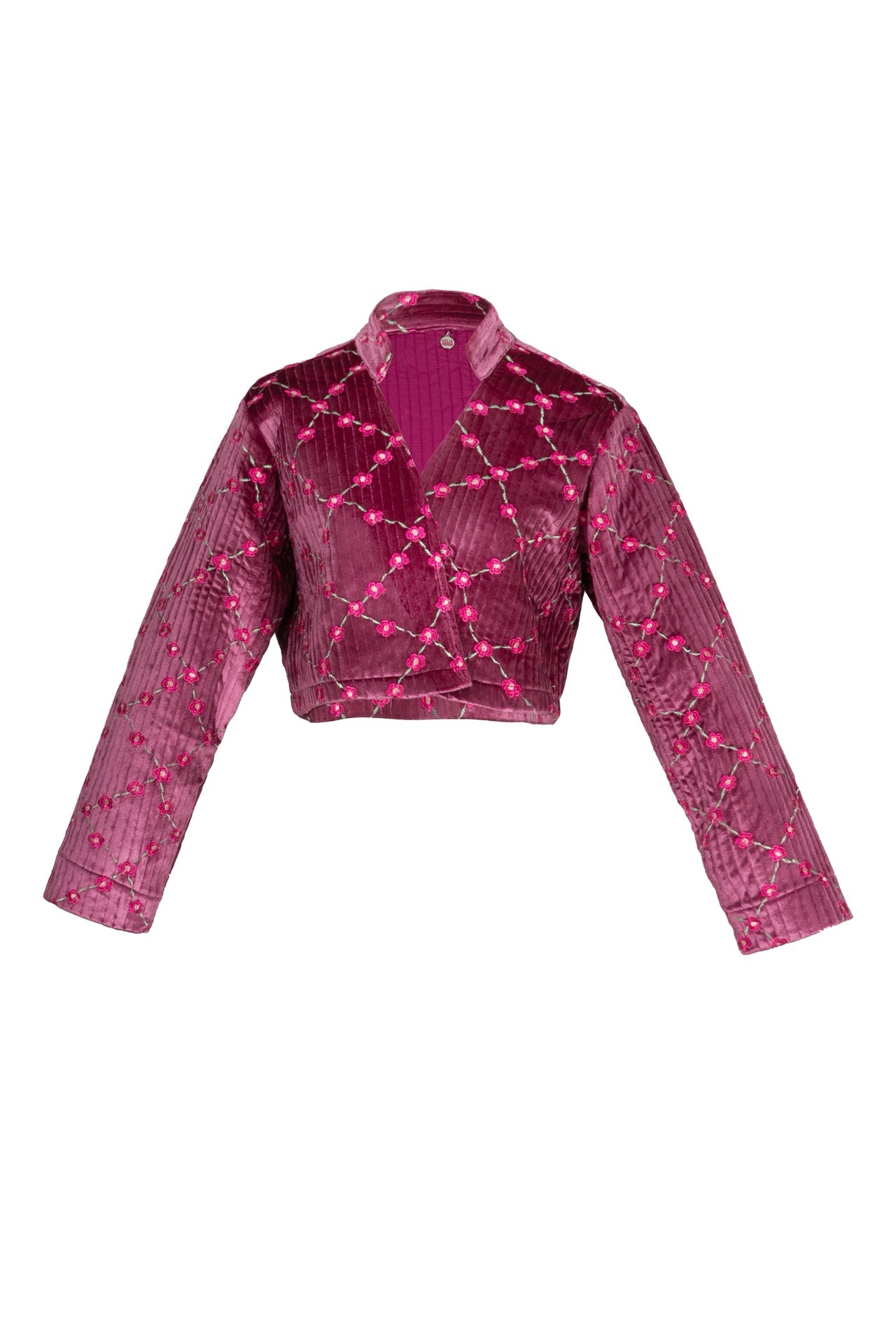 A touch of stellar luxury. The Perseus Jacket is crafted from soft, quilted purple velvet with delicate floral embroidery that catches the light and elevates any look. Its cropped, structured silhouette is perfect for adding contrast to your everyday outfits, while the front-hook closure enhances its refined, romantic appeal. A must-have transitional piece that blends romance and character.