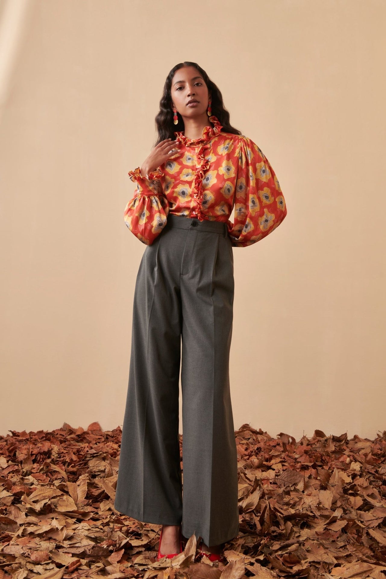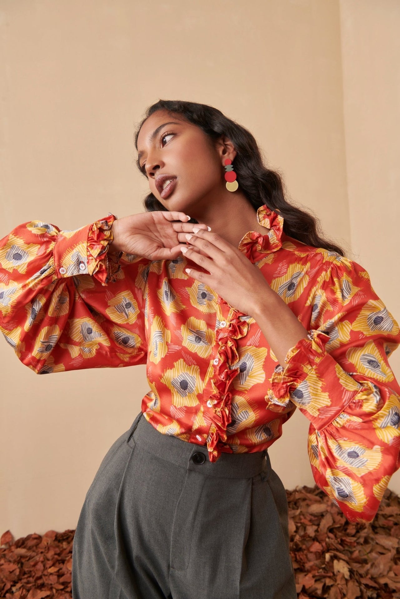 The Aurora Top brings romantic drama to everyday style. Crafted from lustrous silk in a vibrant sunset-orange base with oversized yellow poppy motifs, it features cascading ruffles along the neckline and down the front, plus voluminous puff sleeves with gathered cuffs. Pair it with tailored trousers for an elevated day-to-night look.