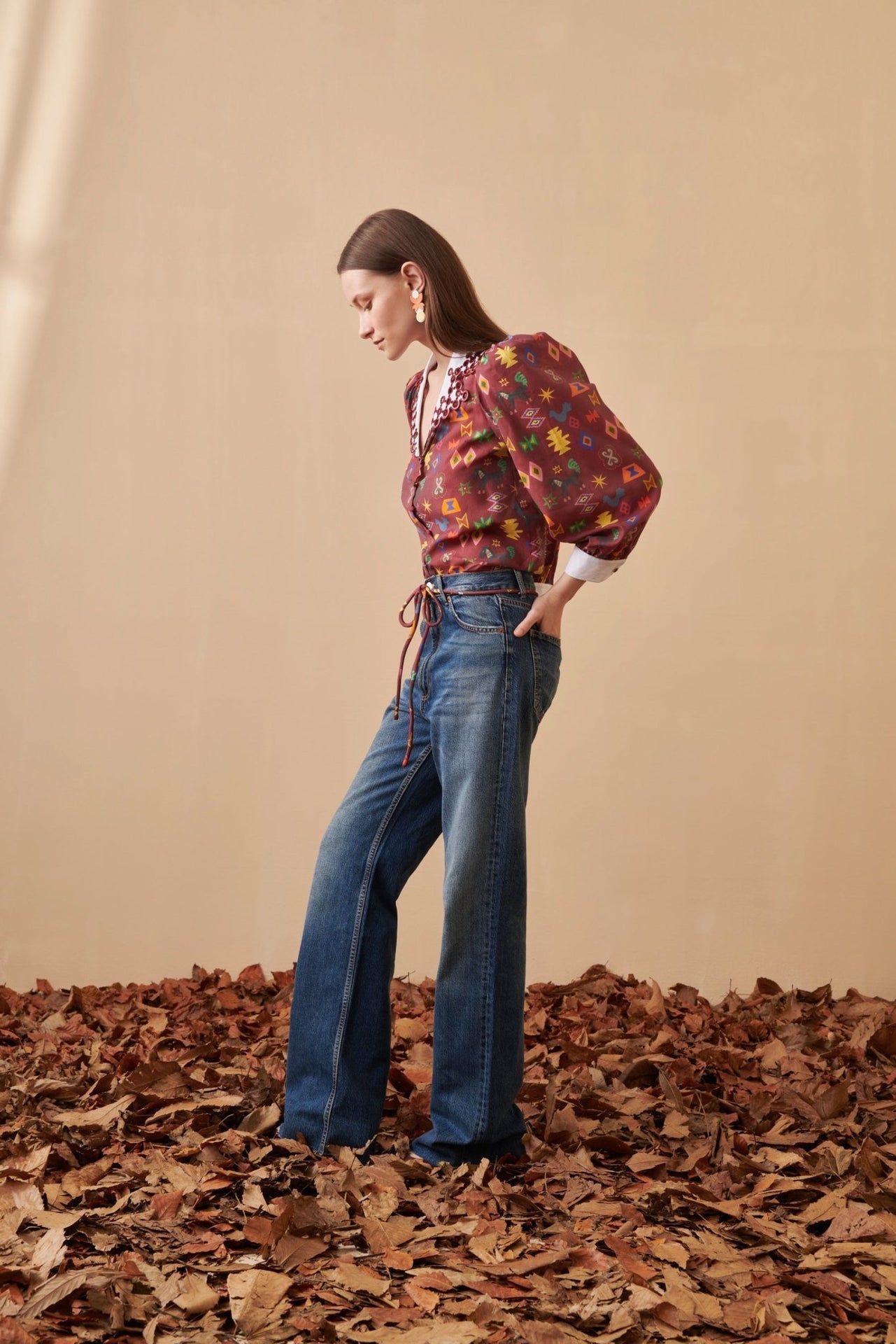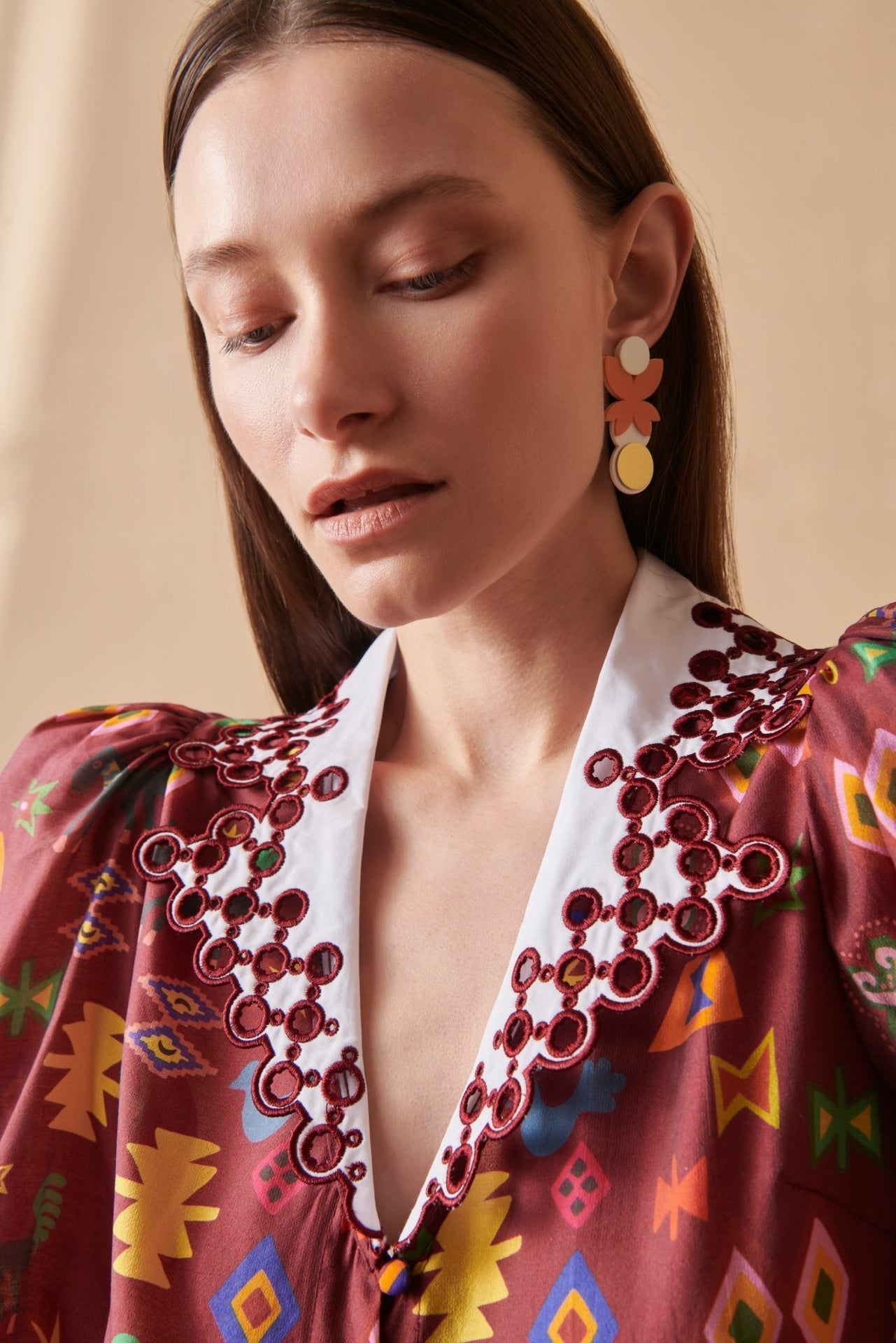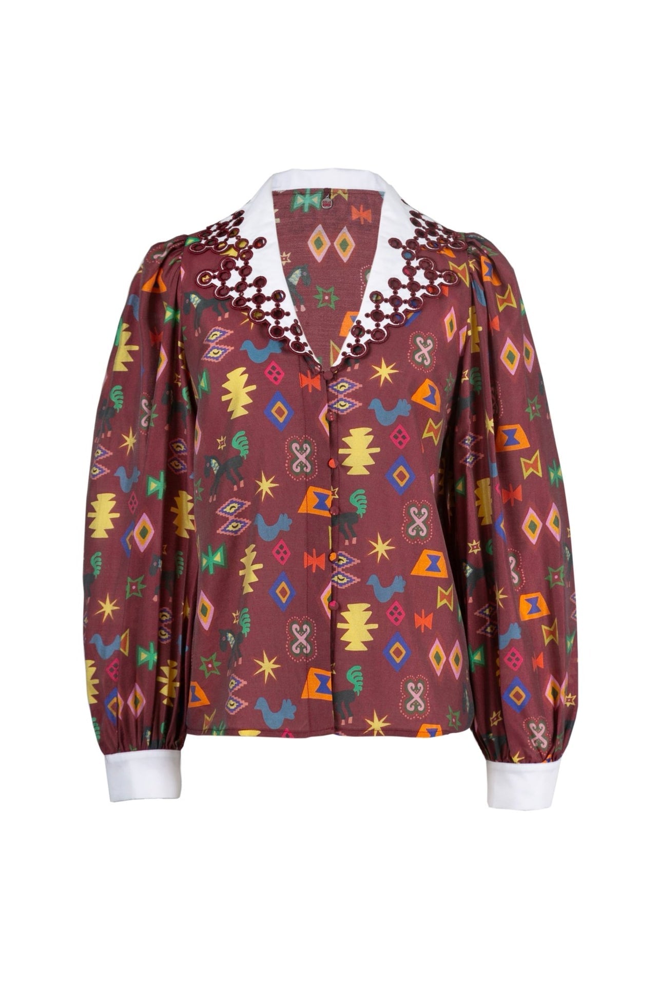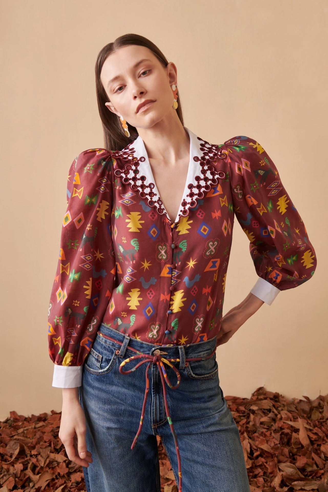The Chérié Top reinterprets the collection’s signature print in a versatile blouse. Set against a burgundy base with multicolor folk-inspired motifs, it features a white pointed collar with burgundy lattice trim, puff sleeves with buttoned cuffs, and a button-down front.