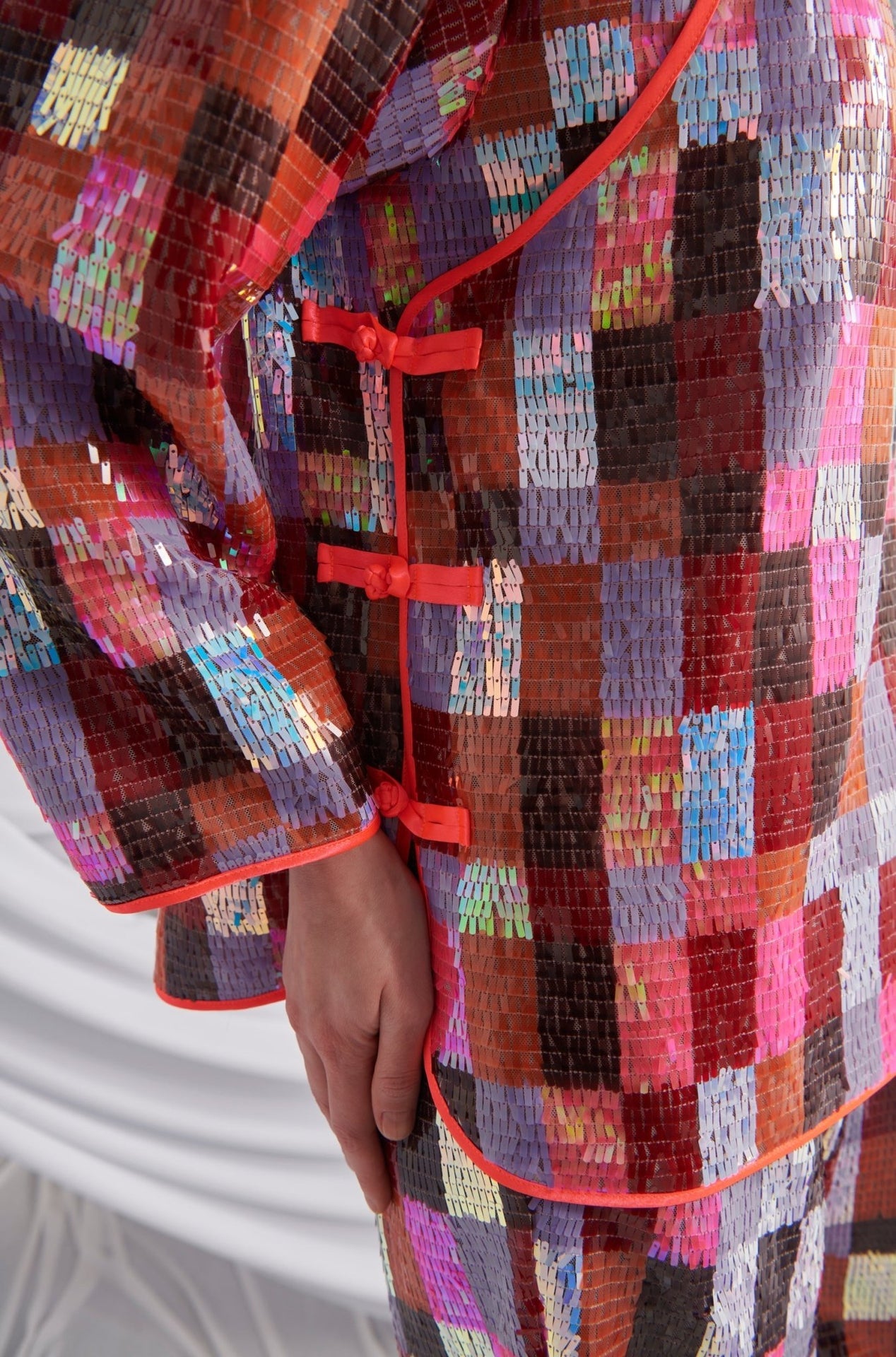 The Esplendor Top combines relaxed tailoring with high-impact sequins in a geometric patchwork pattern. Its straight cut and shimmering finish make it versatile for pairing with the matching pants or styling separately for a playful yet chic look.