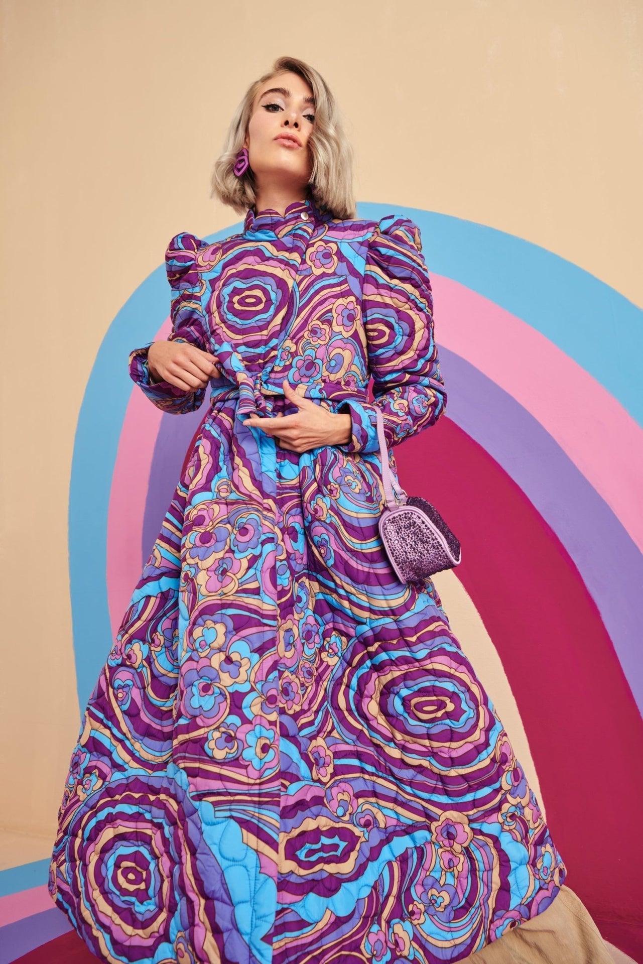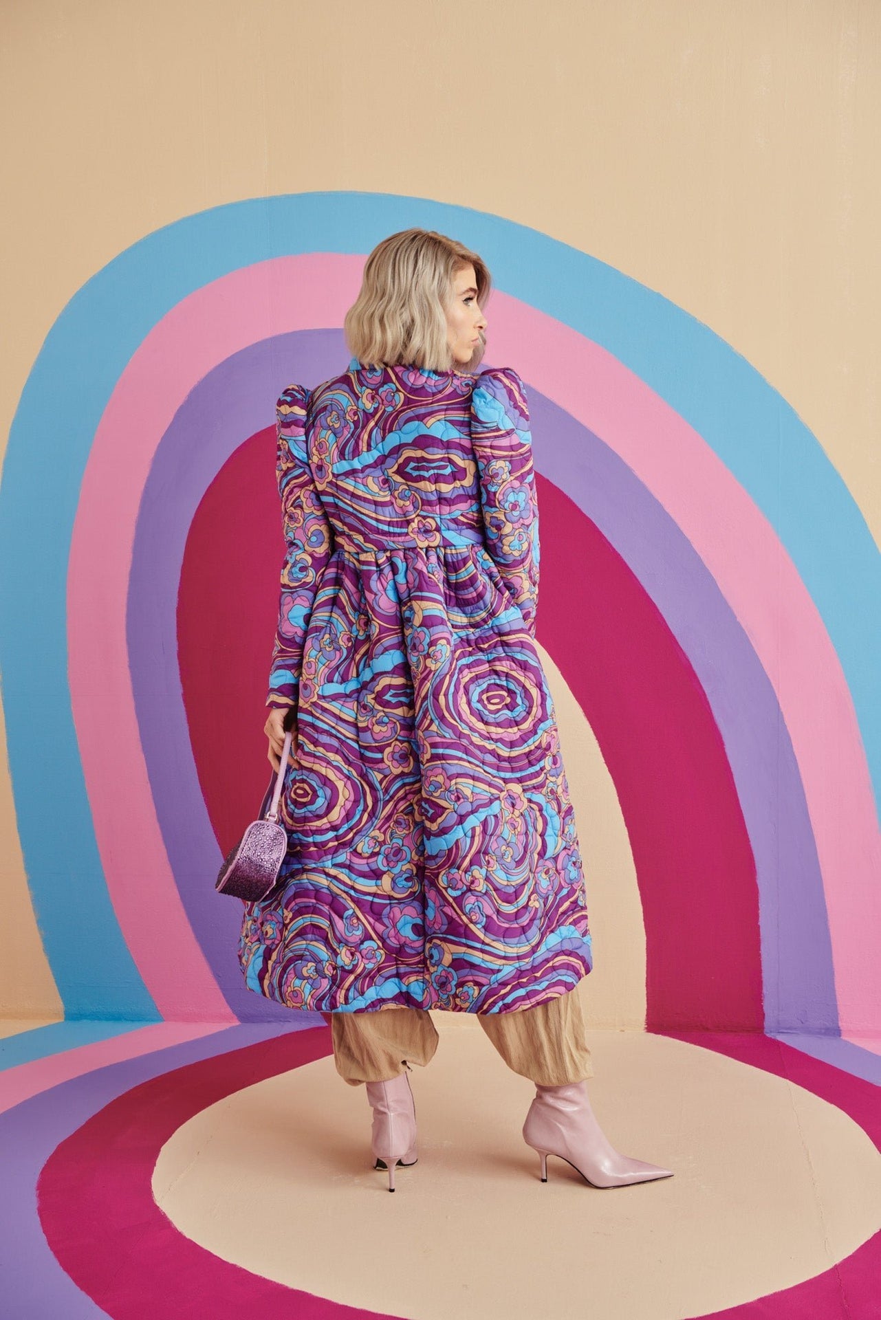 Long quilted patterned coat in blue and purple tones. High neck finished off with a circular edge and a matching belt to really help keep that warmth in. The neck clasp allows you to unbutton the top of the coat, giving you control over it's styling and versatility in its wear.