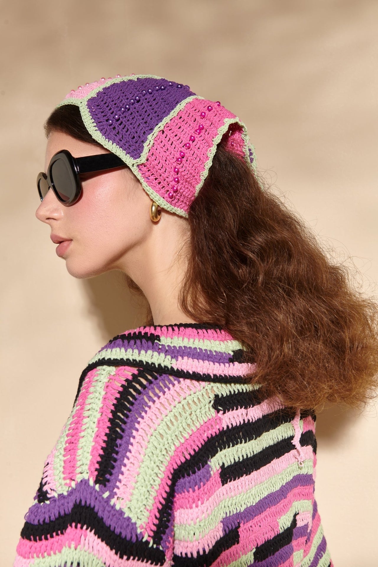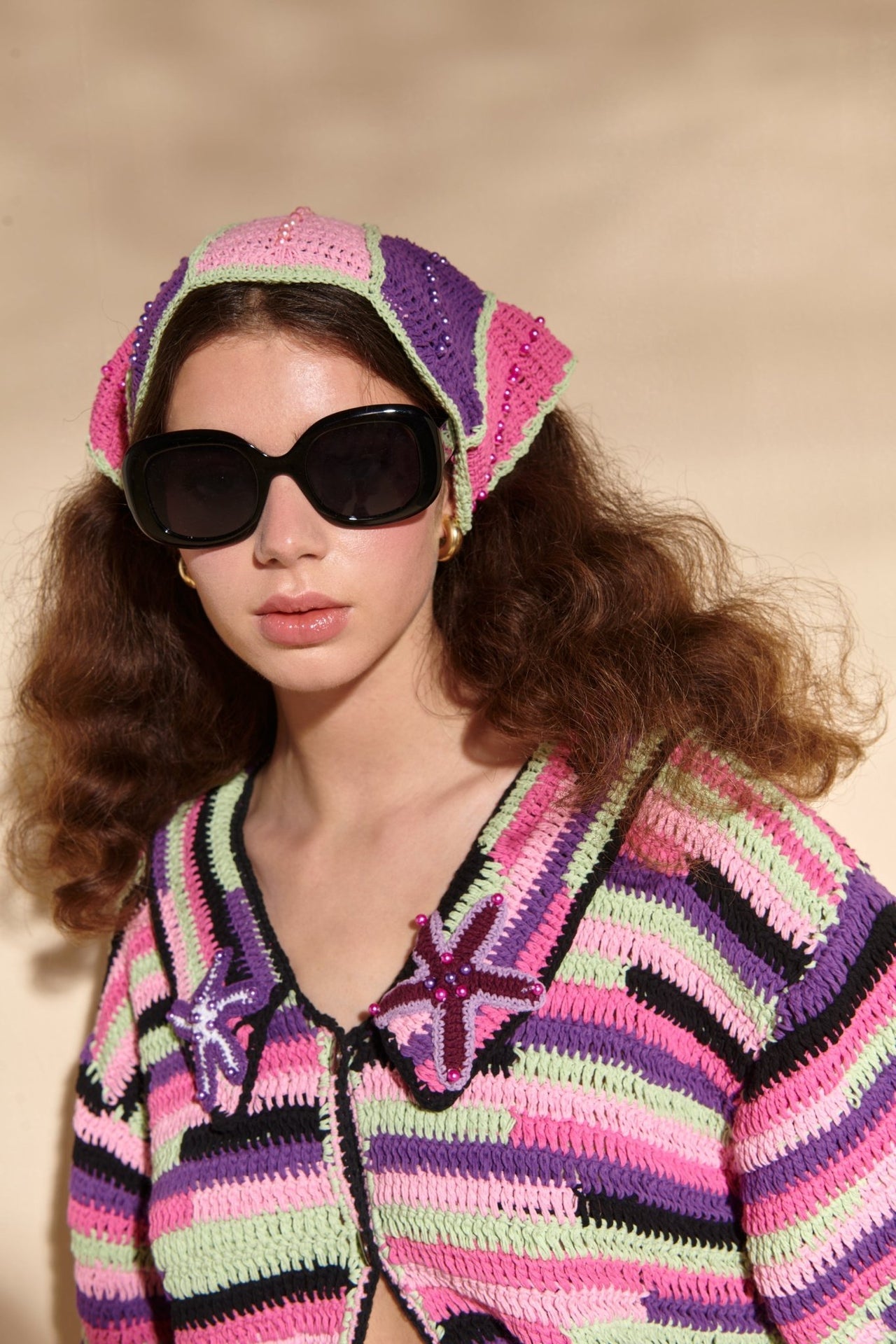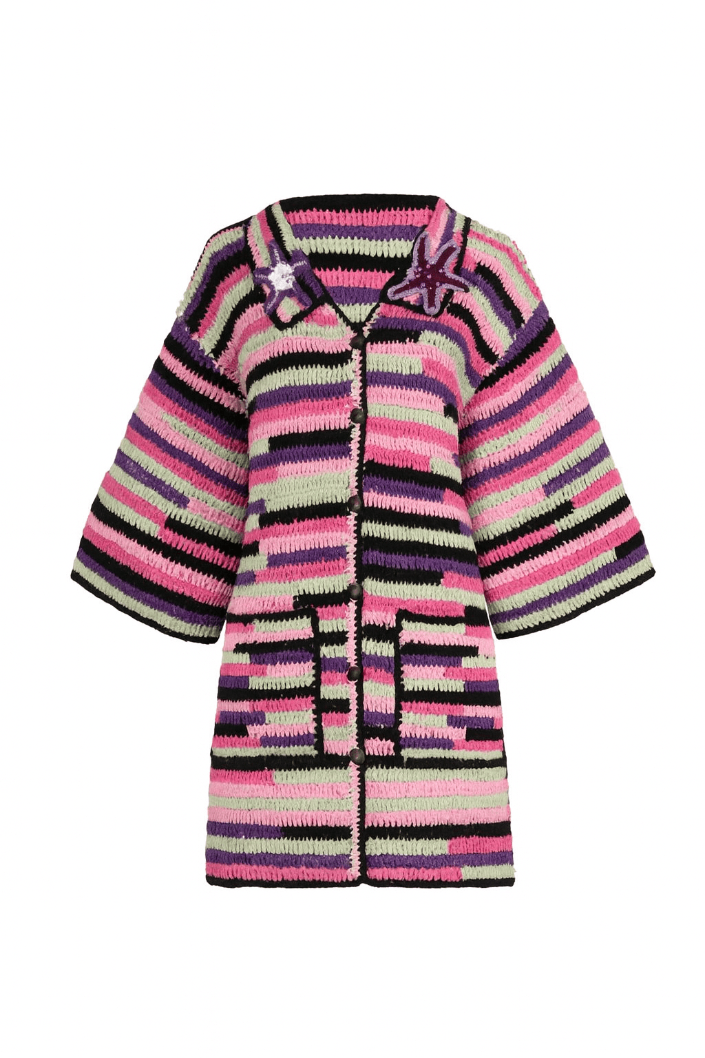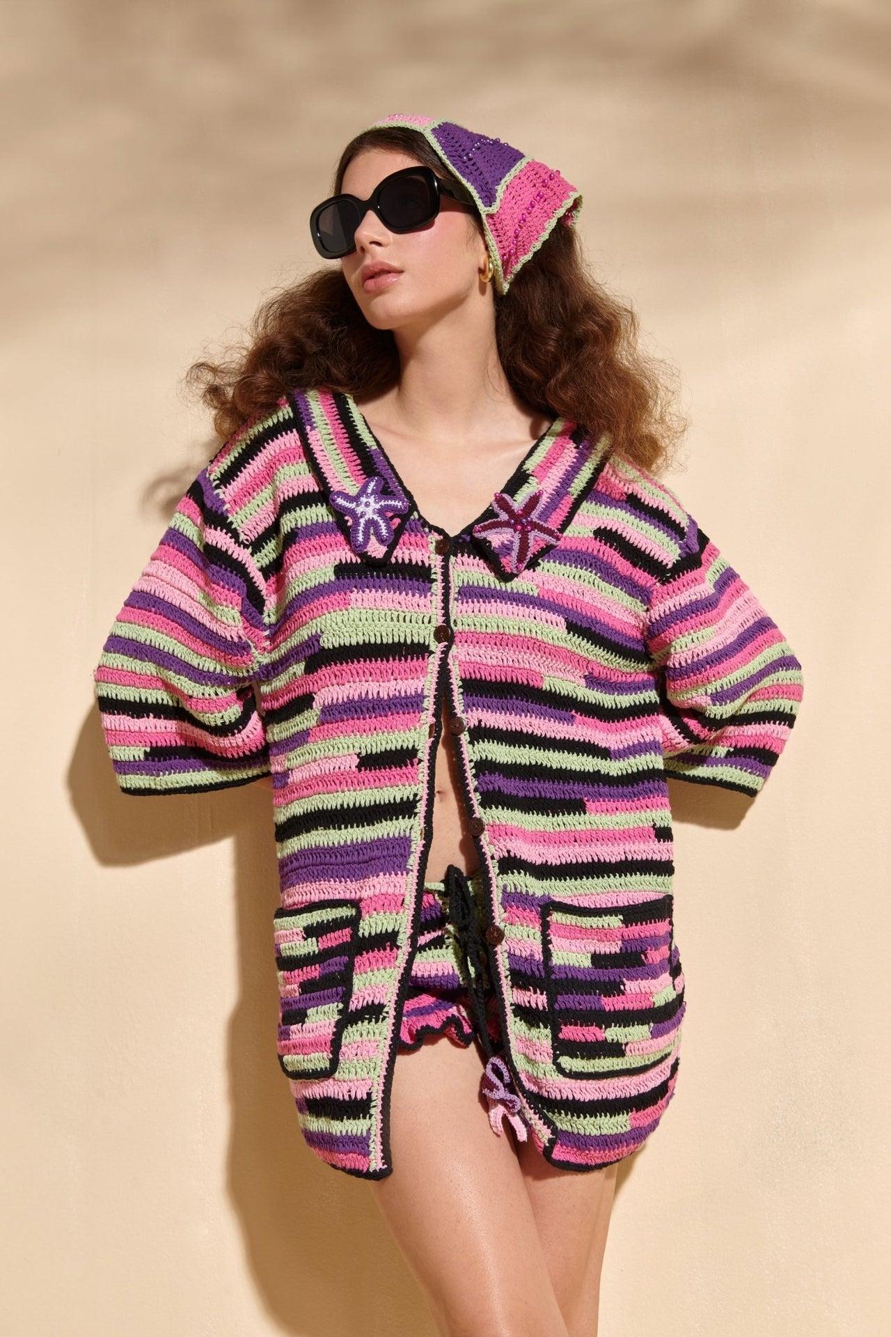 Meet the Eris Dress: a cozy-cool crochet statement that doubles as a dress or oversized cardigan. Crafted in bold stripes of pink, lilac, mint, and black, it features 3/4 length sleeves, front patch pockets, and contrast buttons. Starfish appliqués on the collar add a whimsical touch, while the relaxed fit makes it endlessly wearable.