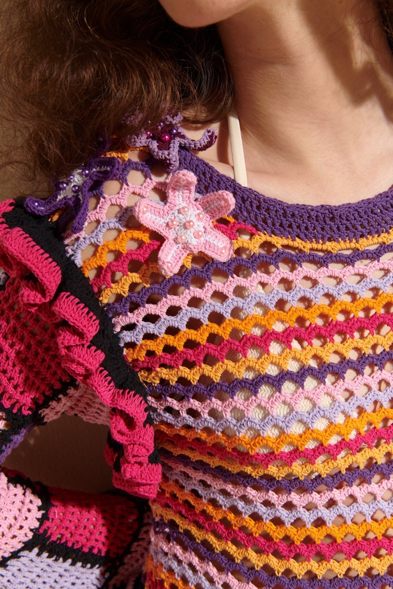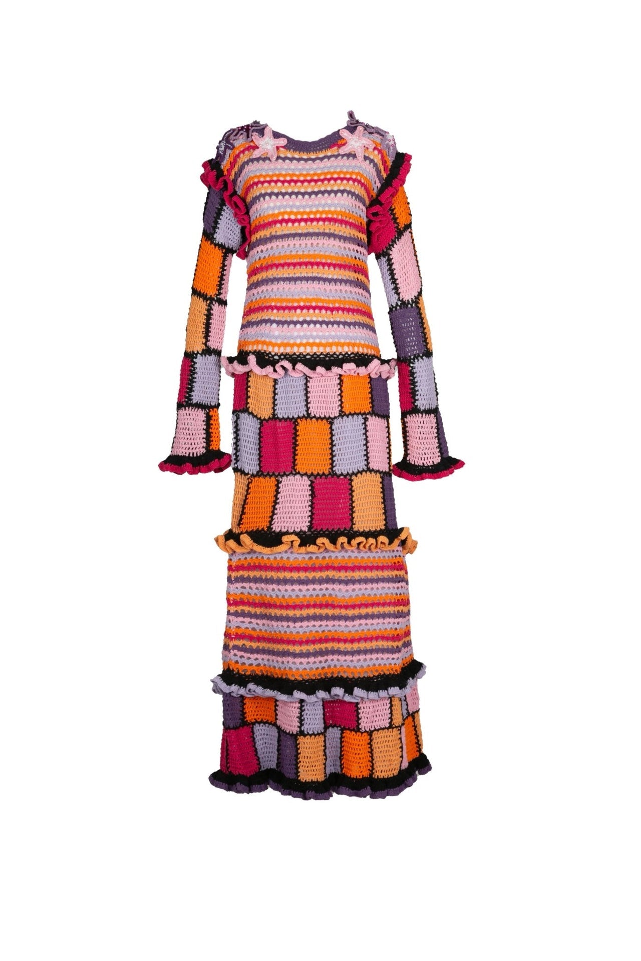 A cosmic clash of color and craft, the Jupiter dress is a maximalist dream. The long-sleeve top is hand-crocheted in fiery stripes of orange, pink, and burgundy, trimmed with ruffles at the cuffs and shoulders for added flair. The matching maxi skirt alternates checkerboard squares and horizontal bands, creating rhythm and richness with every step.