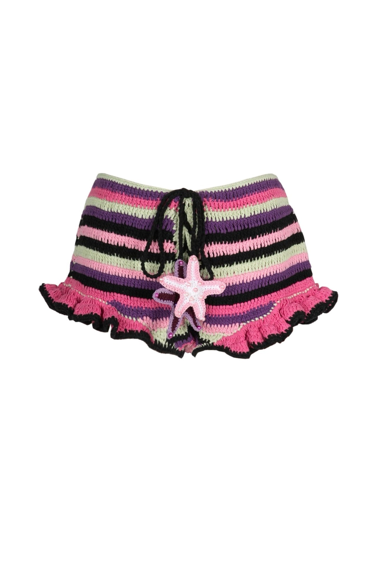 The Mercury shorts bring playful energy to any summer look. Hand-crocheted in bold candy-colored stripes, they feature a flirty ruffled hem, adjustable lace-up front, and pom-pom tassel ties for extra charm. The fit hugs the hips and flatters the waist while still allowing for movement and ease.