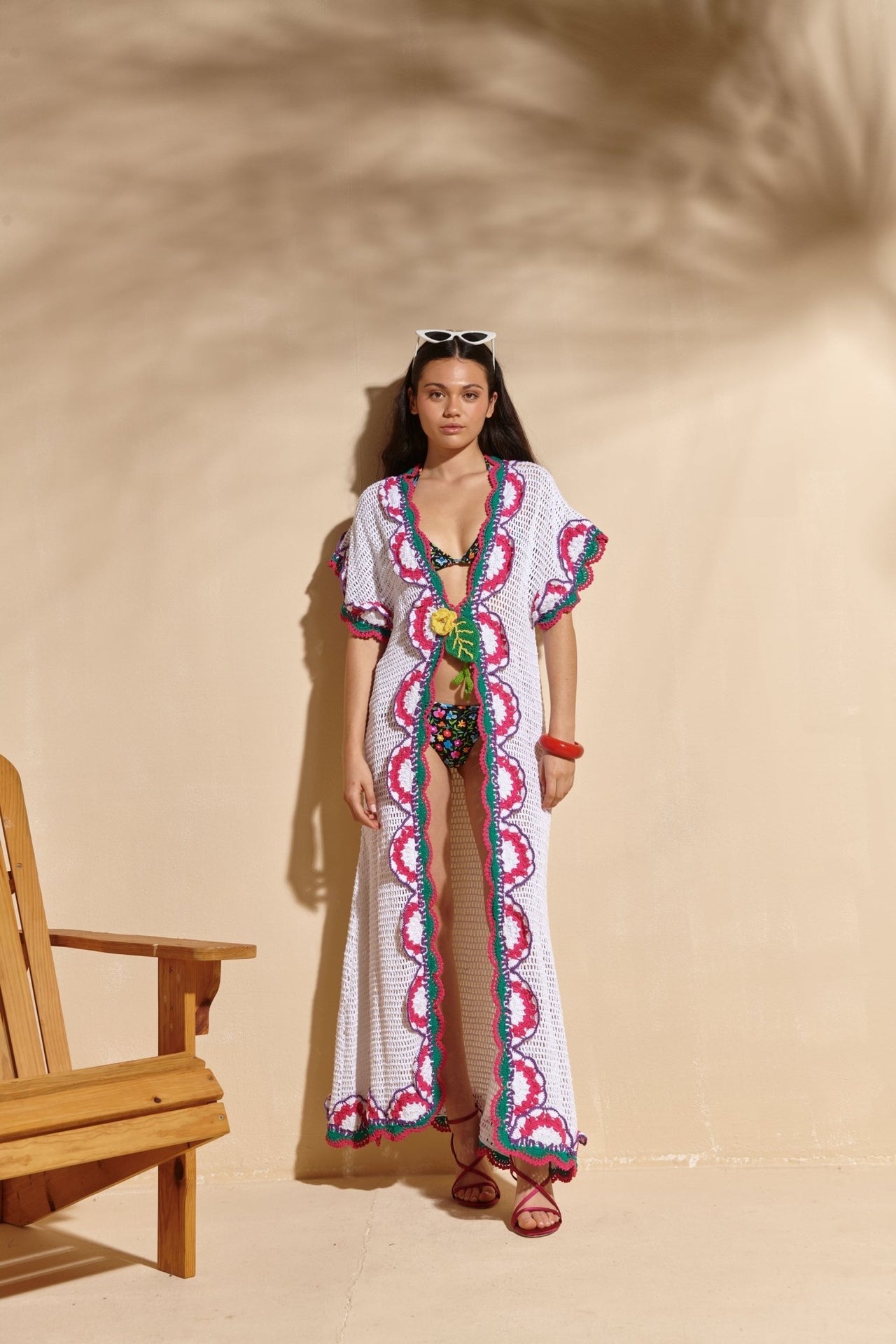 The Nunki cover-up is a celebration of color, craft, and carefree summer days. Hand-crocheted in crisp white with bold scalloped trim in magenta, green, and violet, it’s finished with a sunny yellow flower appliqué that ties at the waist. The open-weave texture lets your swimwear peek through, while the floor-length silhouette adds a touch of drama and elegance.