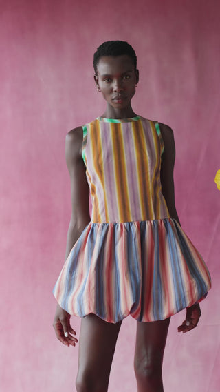 A playful mini dress with sculptural contrast. The fitted bodies create structure, while the voluminous bubble skirt adds a bold and modern twist.