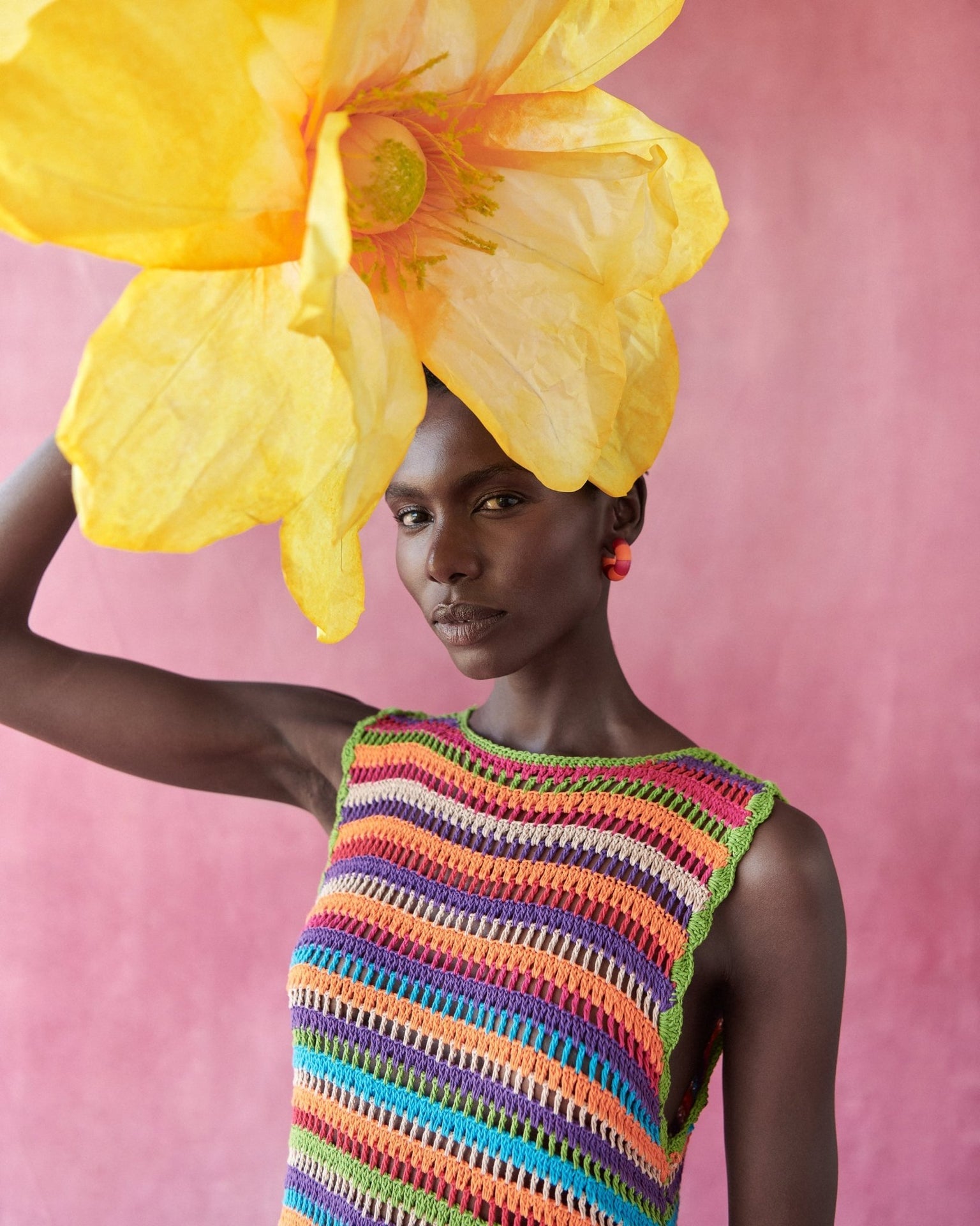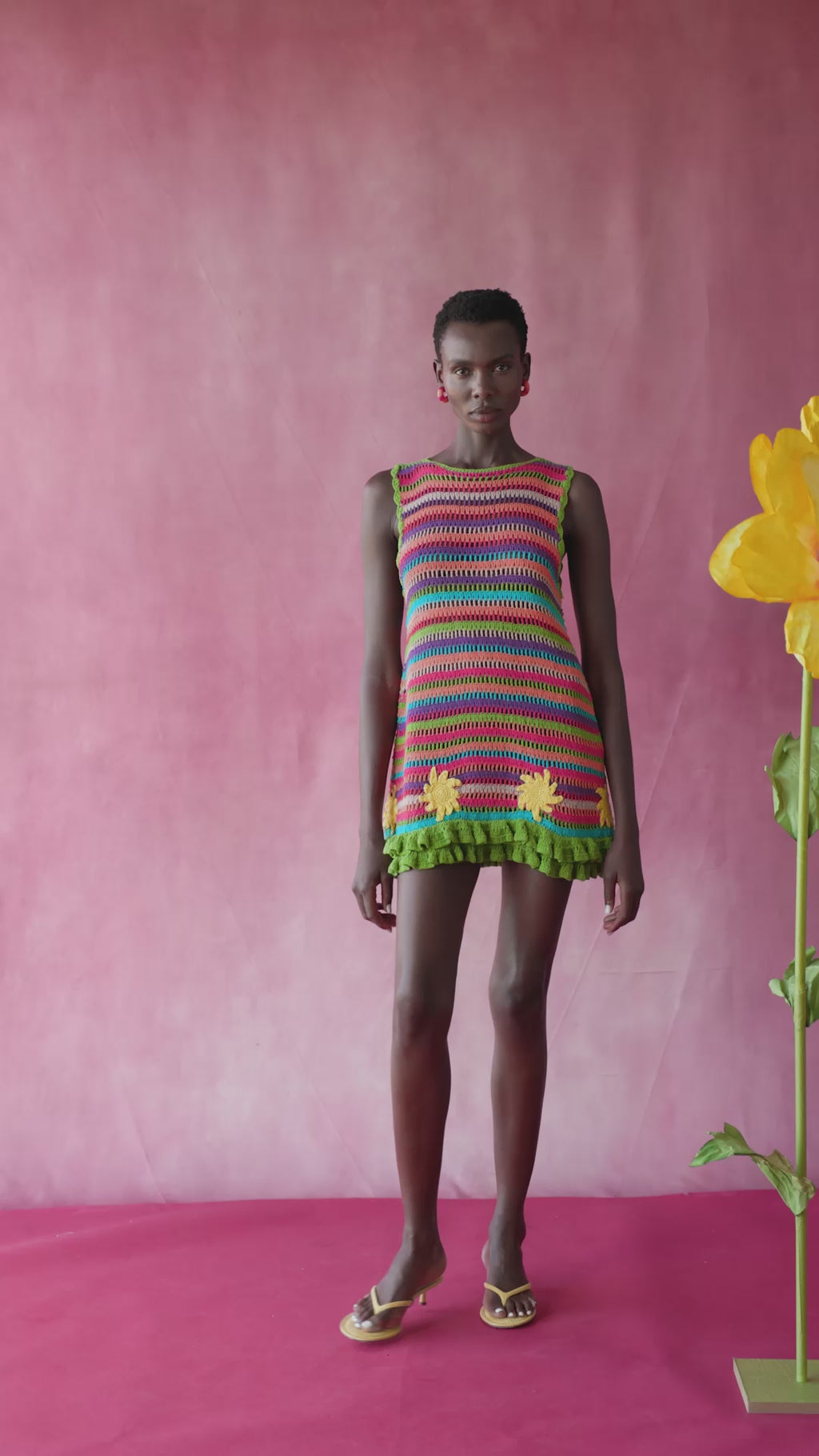 A joyful short crochet dress crafted in vibrant stripes. Designed with a round neckline, it balances structure with ease.