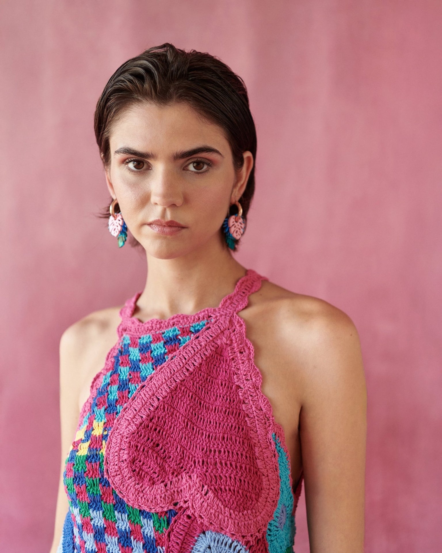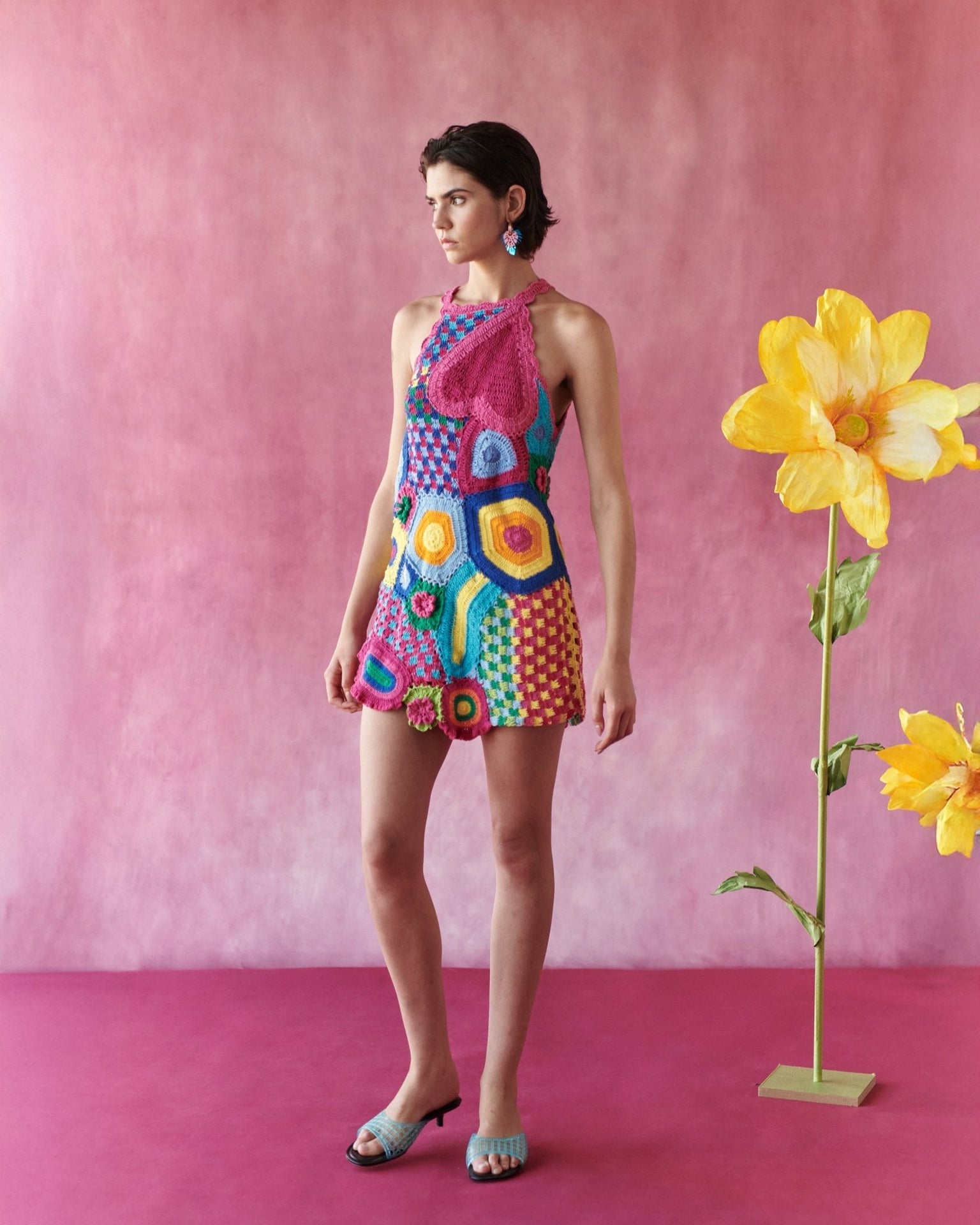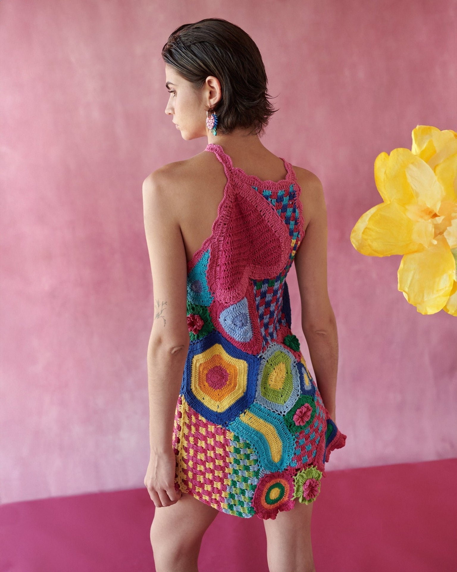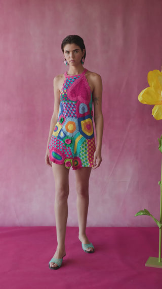 A colorful short crochet dress full of personality and charm. Designed in an easy silhouette, it features floral embroideries that add visual texture.Openwork crochet details enhance lightness and breathability.Fresh, playful and made for sun filled days and tropical escapes.