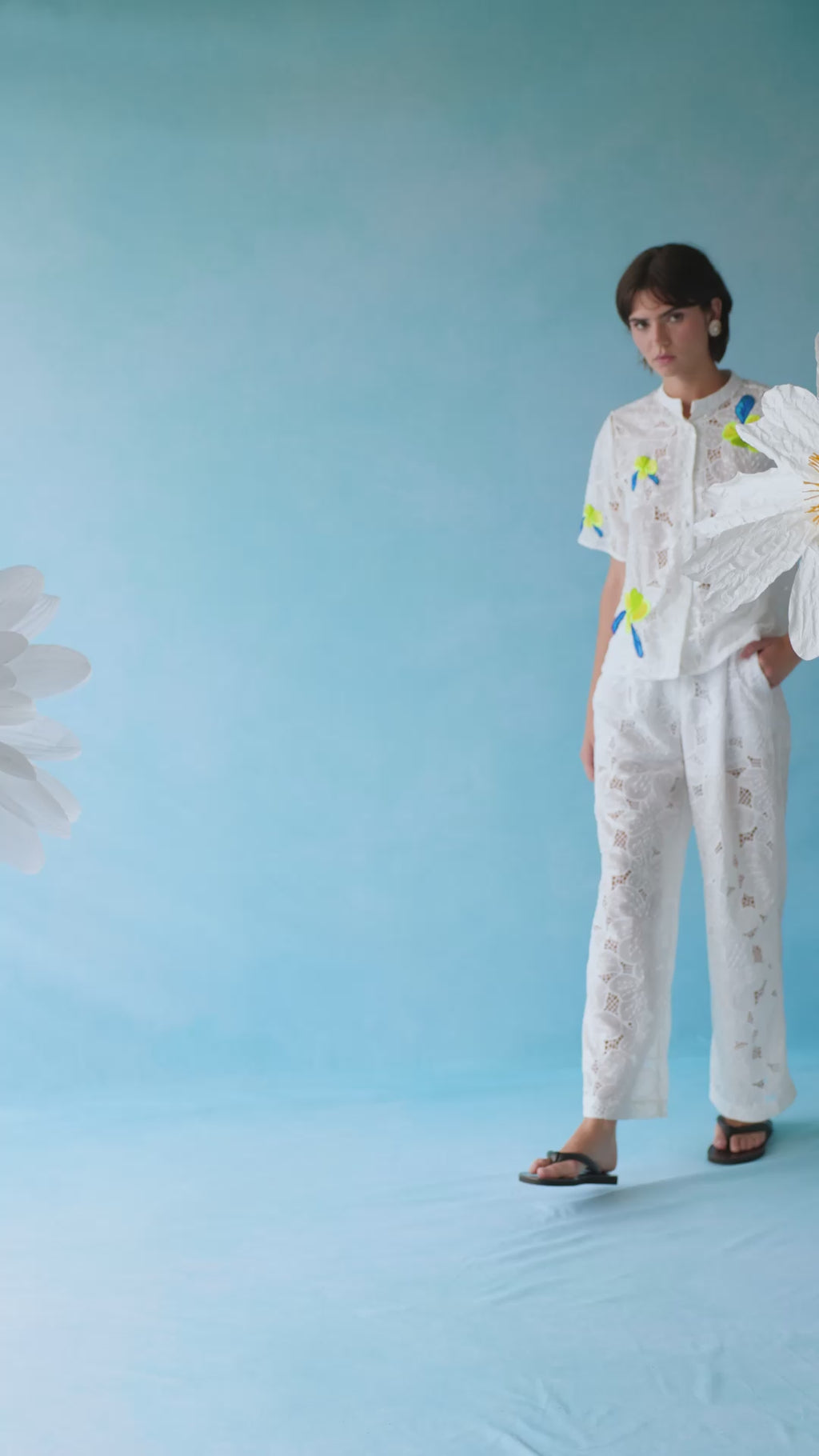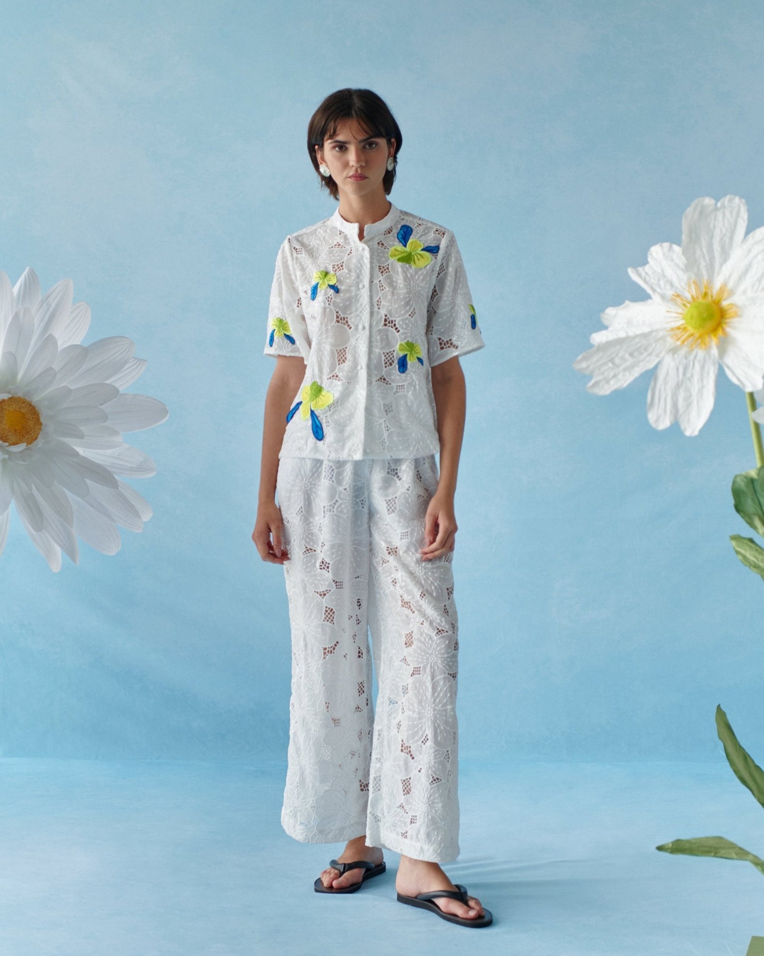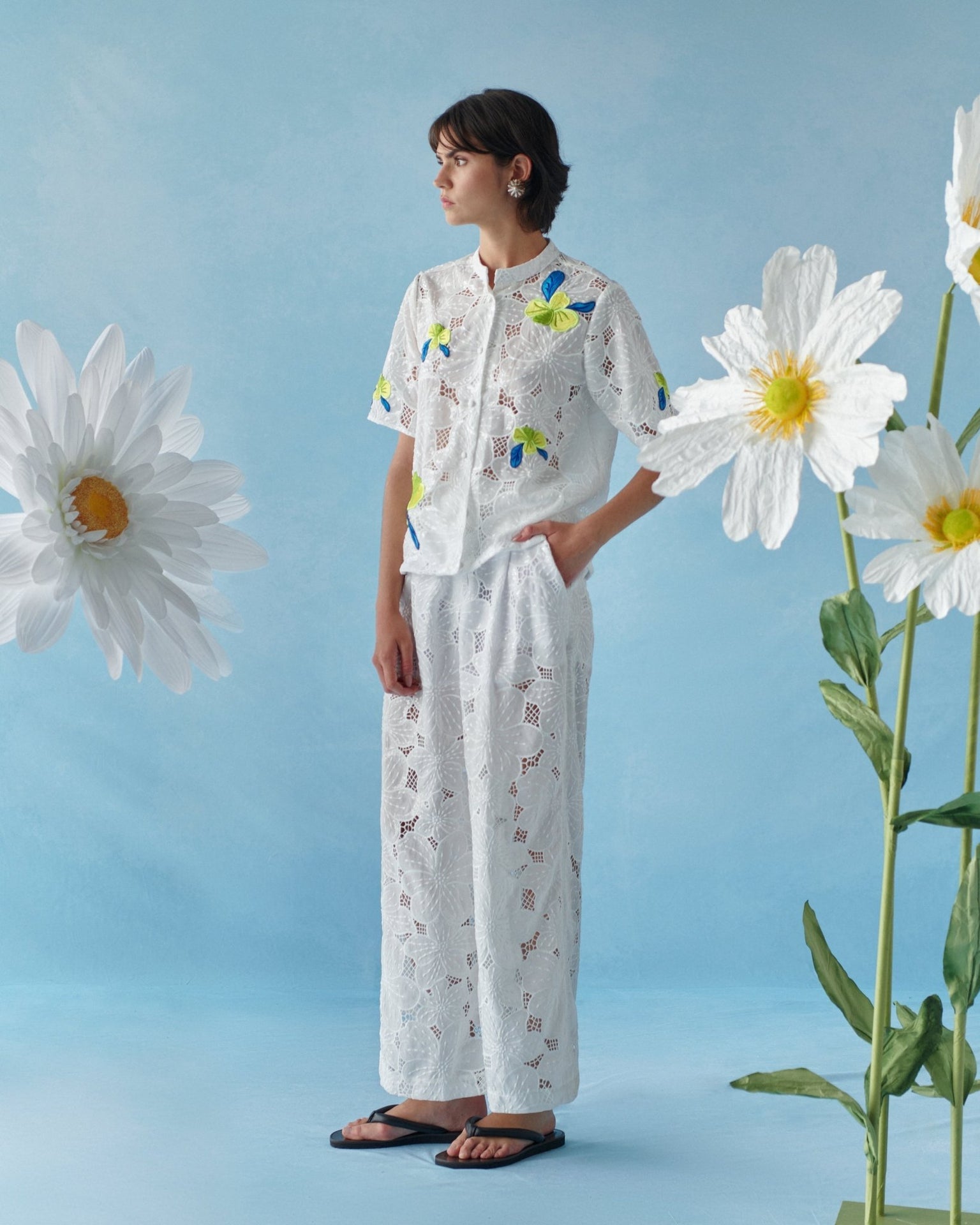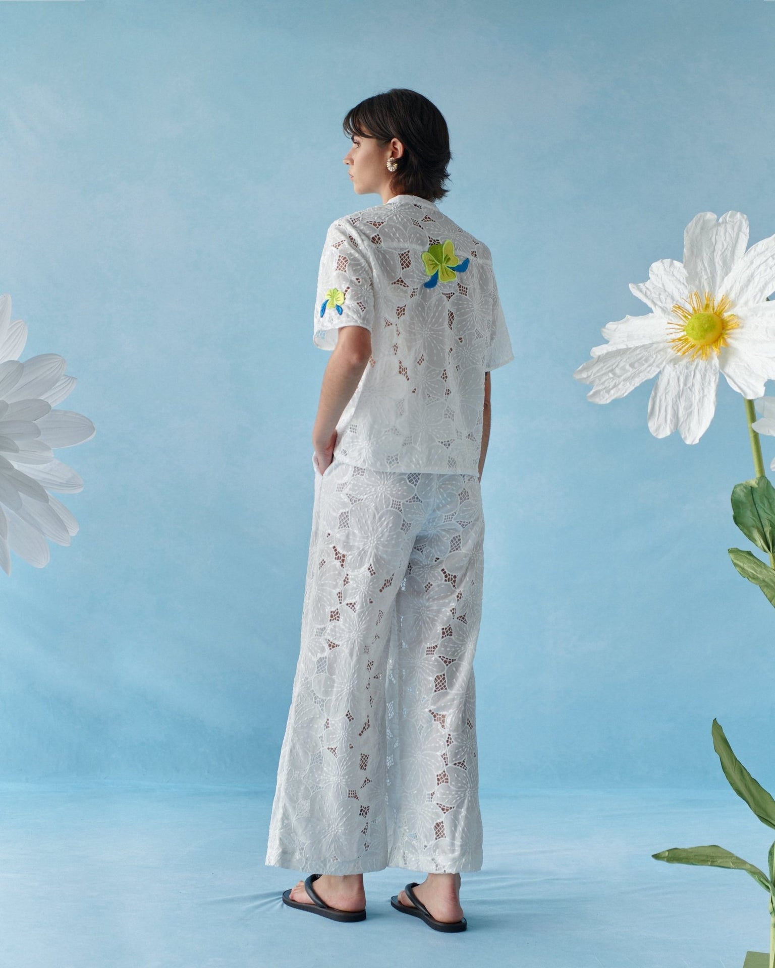 Crafted in floral lace enriched with sequins, the fabric catches the light beautifully. Yellow floral brooch details with blue accents add a playful and elegant touch.