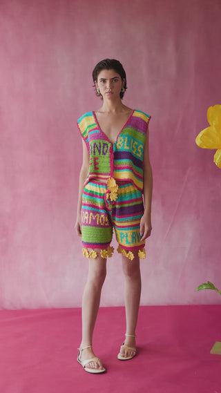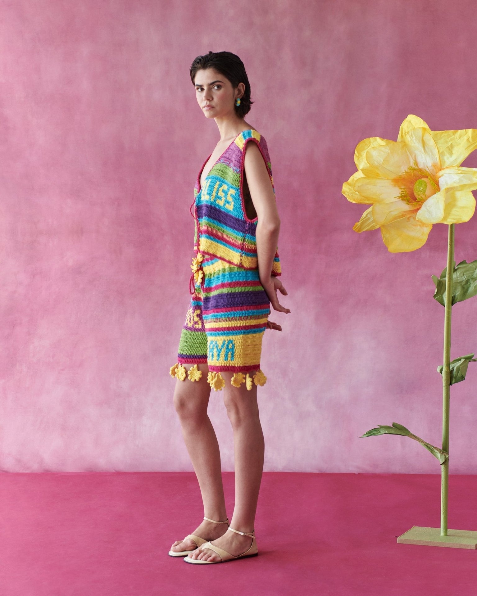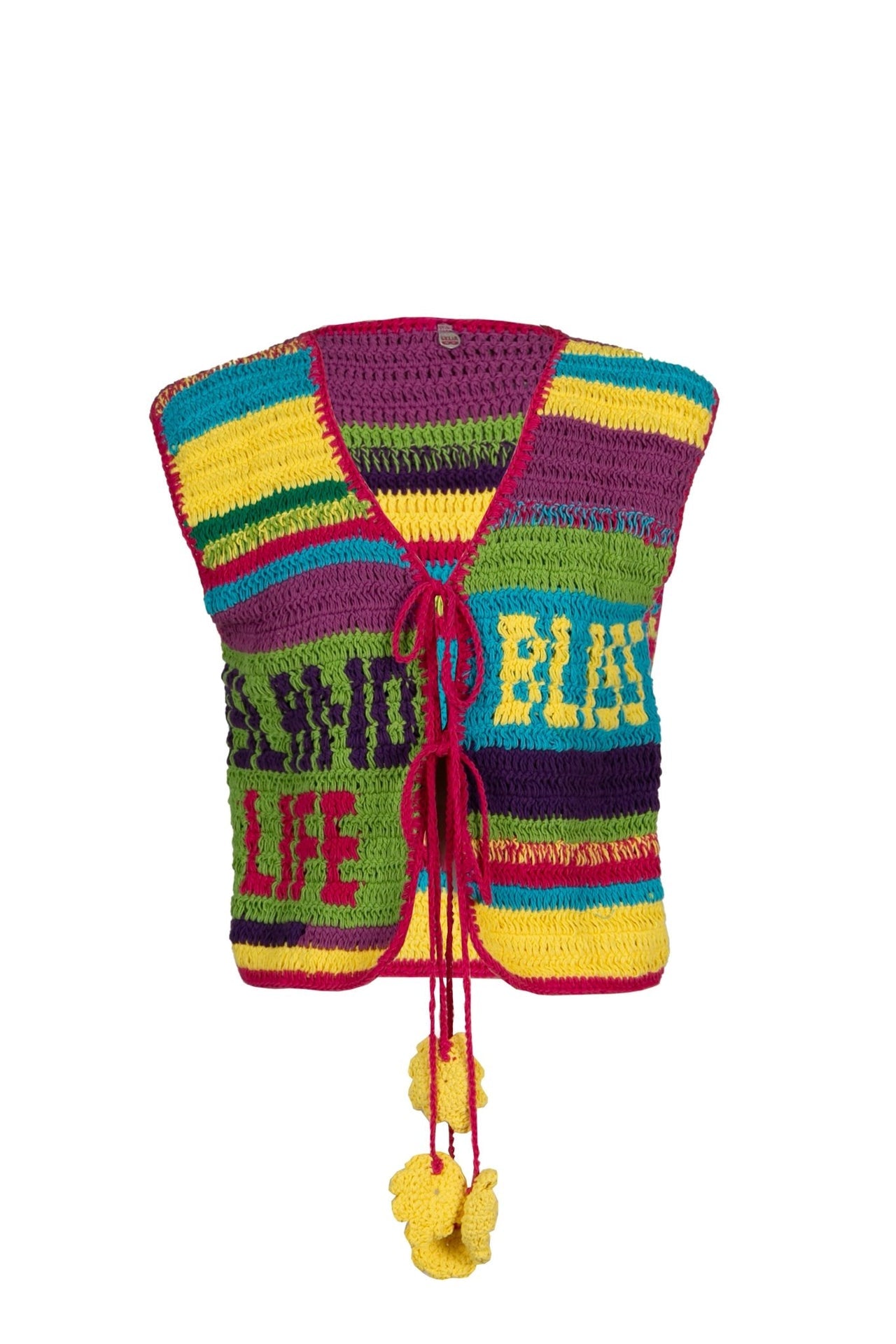 The vibrant stripes and textured crochet give it strong visual impact.