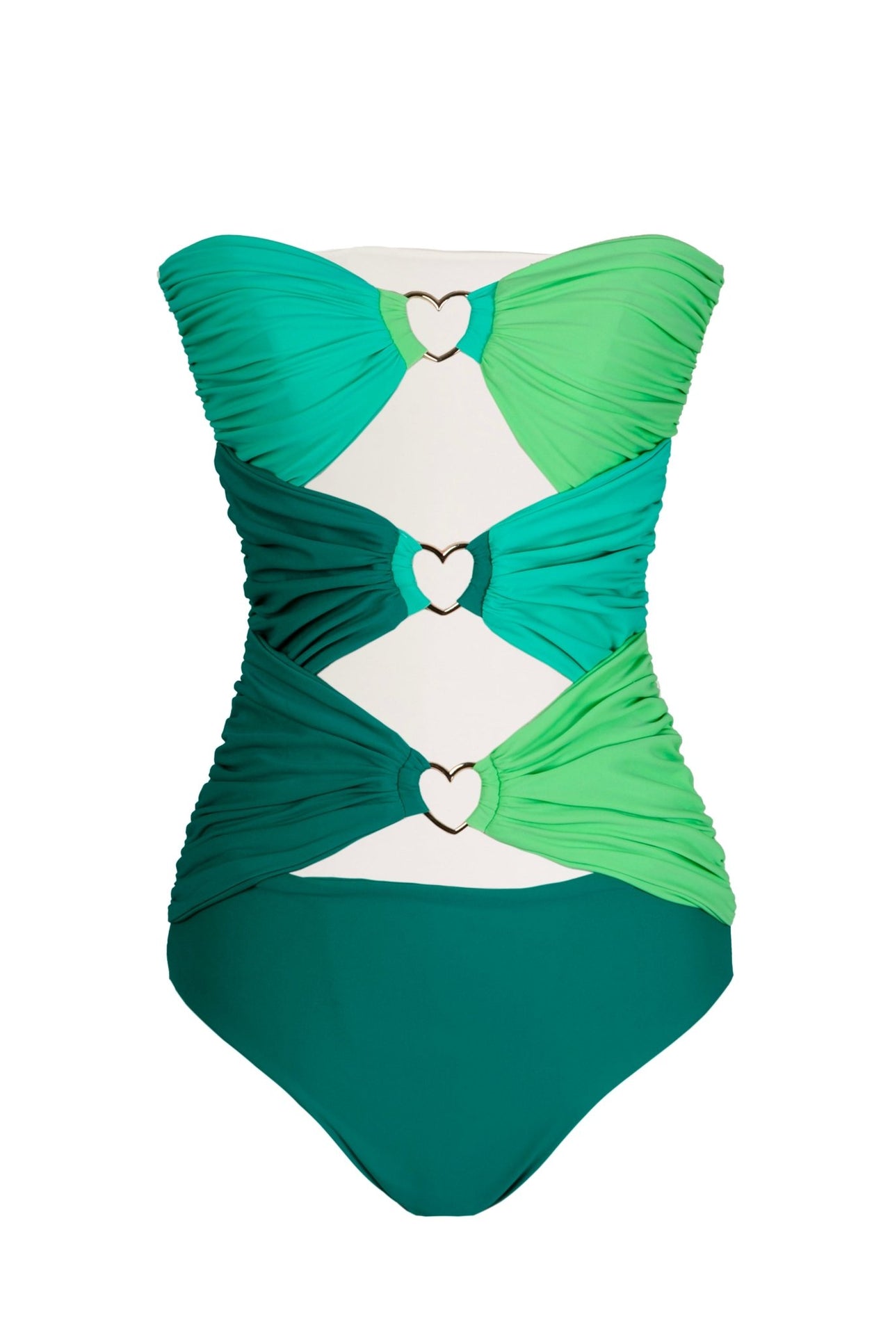 ¡Hora de un baño sexy! Este traje de baño verde de una pieza con aperturas llamará la atención. Con detalles metálicos en forma de corazón, escote bandeau y tonos verdes alternados, ¡te hará sentir la más segura!