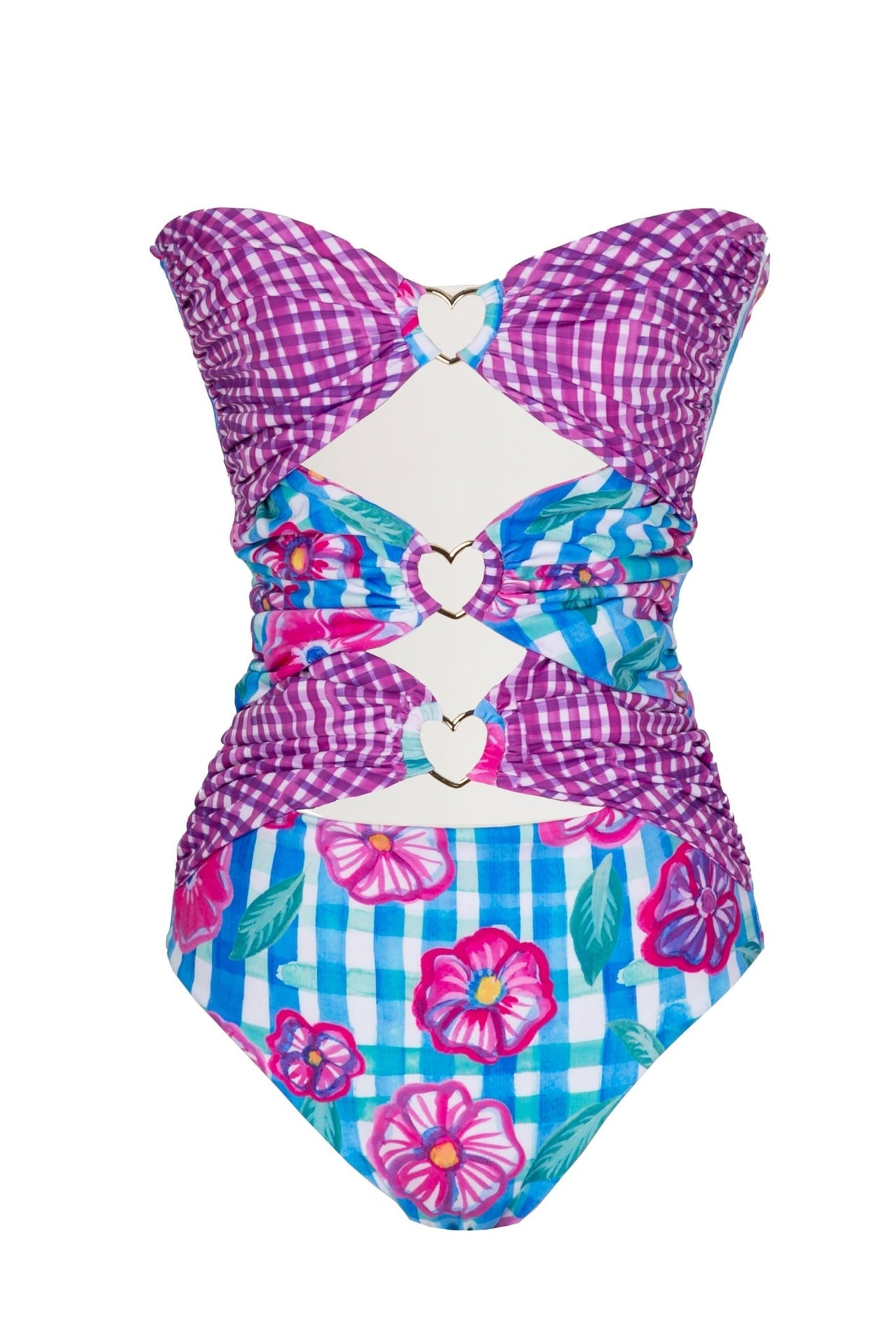 Un bañador bandeau único, con divertidos estampados de cuadros vichy y flores para un look llamativo. El diseño presenta tres aberturas en forma de corazón. ¡Perfecto para la playa!