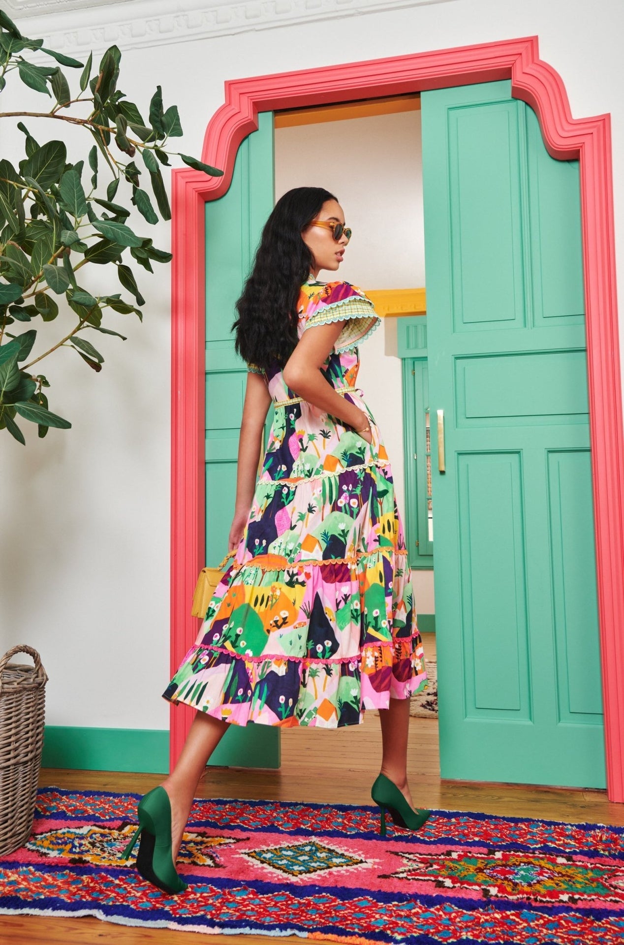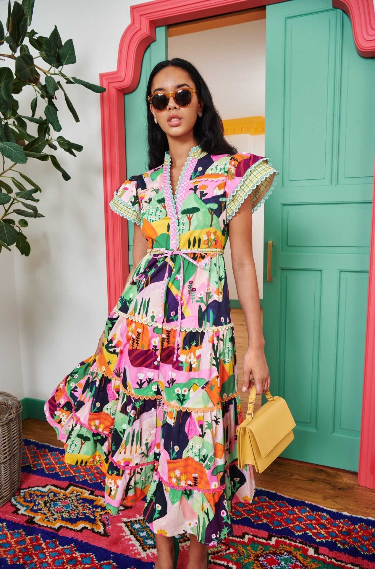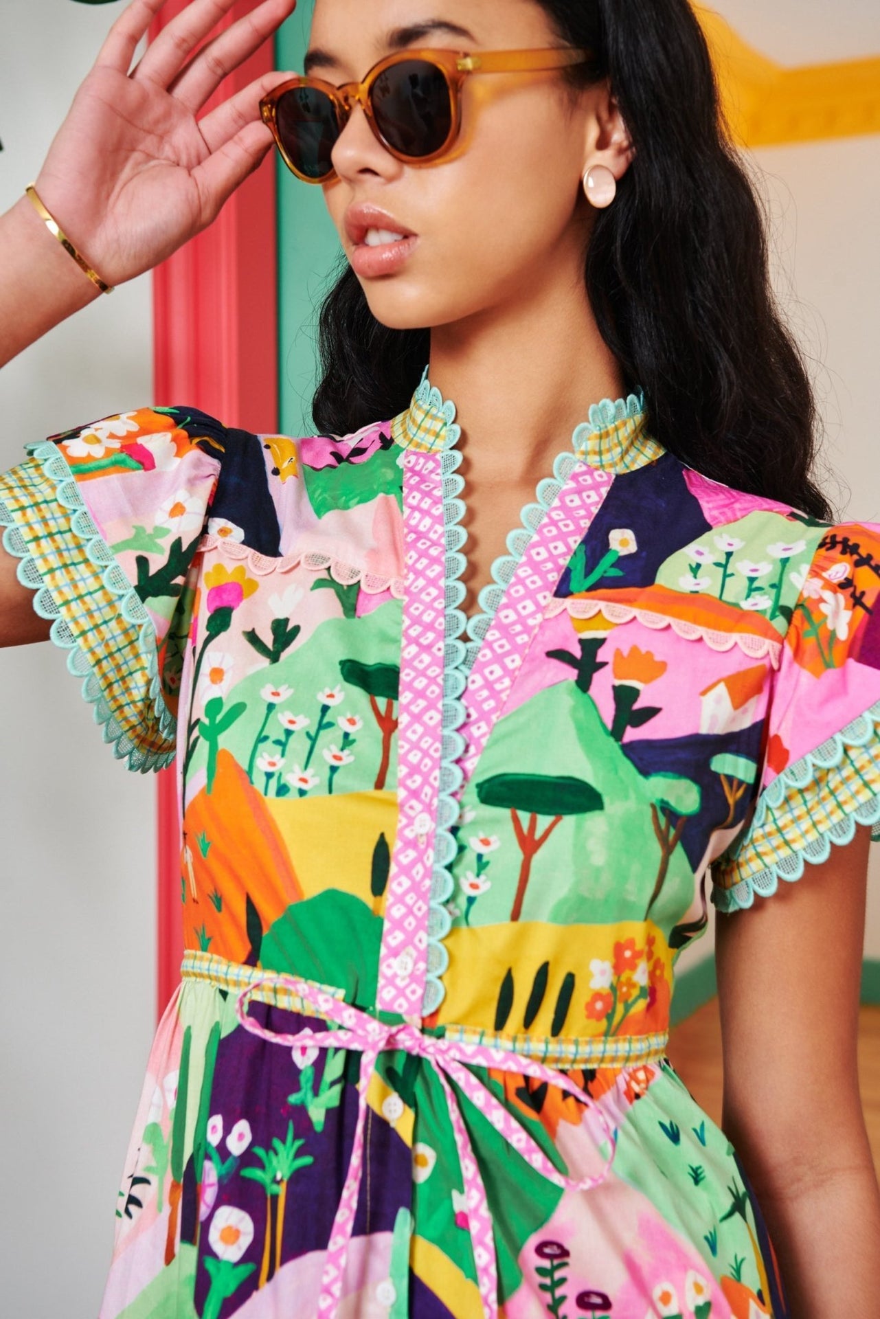 Nuestro modelo más vendido: un novedoso vestido midi con estampado de paisajes, confeccionado en una mezcla de algodón reciclado. Los ribetes festoneados en las mangas y la falda, con un cómodo cordón ajustable, crean una silueta favorecedora.