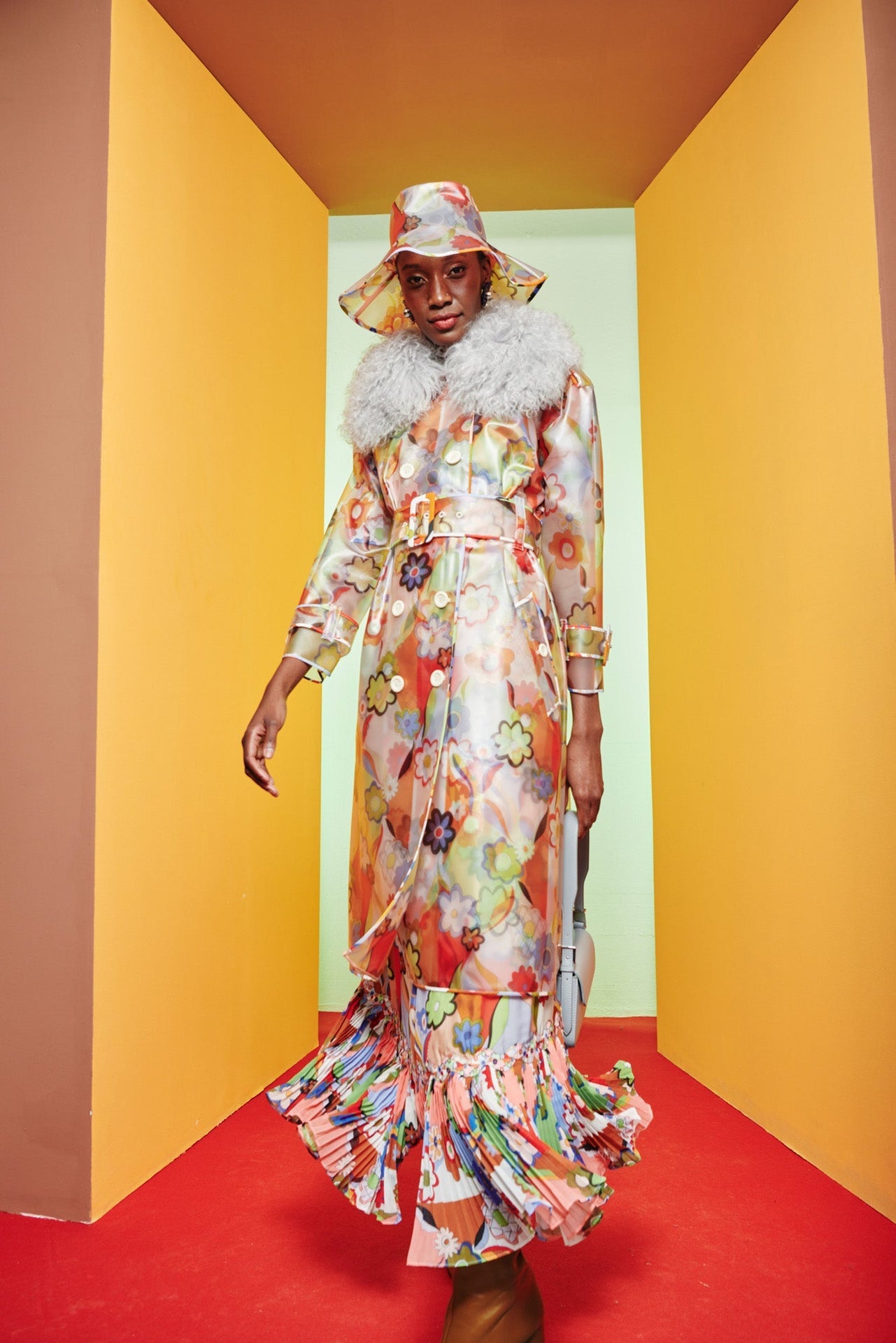 Rain hat with a transparent floral print. Pair it with a linen trench coat for a coordinated look, or wear it on its own for the perfect fun pop of color.