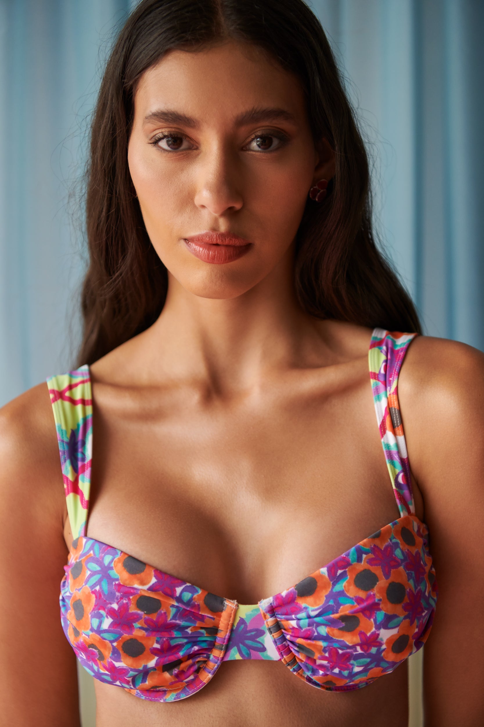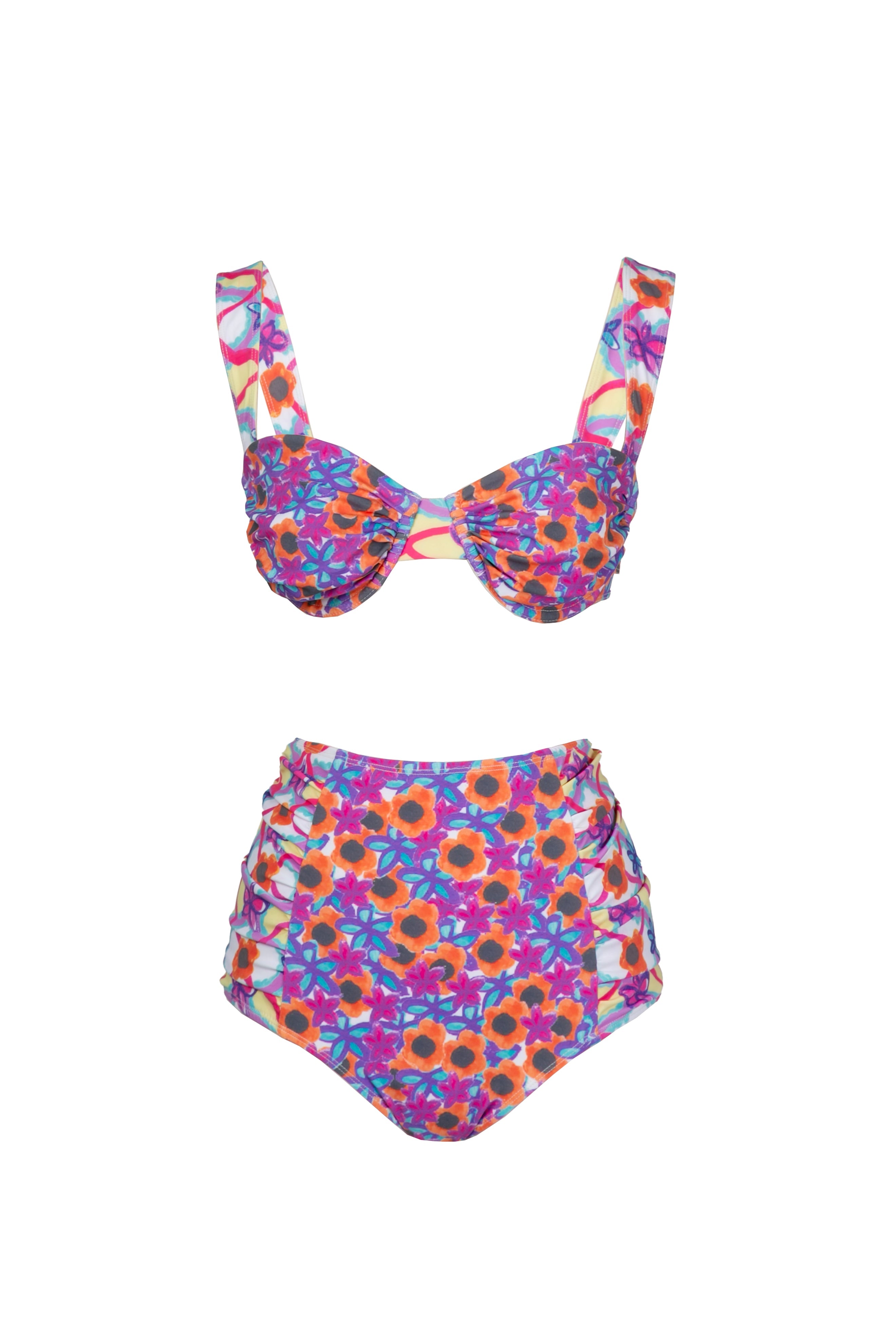 The balconette top offers support with adjustable straps for a customized fit, and the high-waisted bottom features ruching details for added texture and a retro-inspired fit that accentuates the waistline. Topped off with a stunning pattern in blues, purples and oranges.